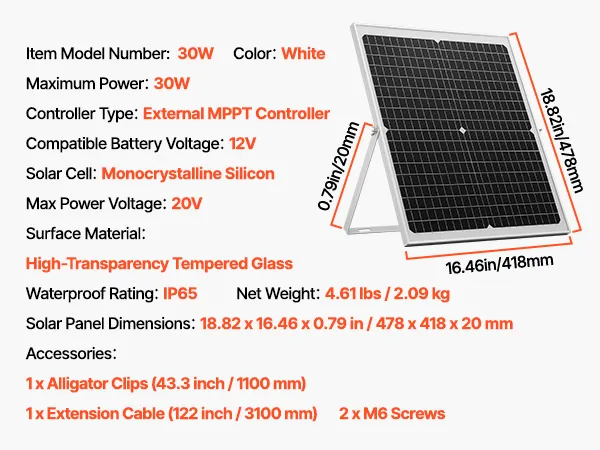 Say goodbye to drain batteries! Our 30W 12V solar battery trickle charger maintainer harnesses the sun's energy to deliver reliable power for your 12V batteries. Built with high-efficiency monocrystalline solar cells, it ensures stable charging and maintenance for cars, RVs, boats and more.