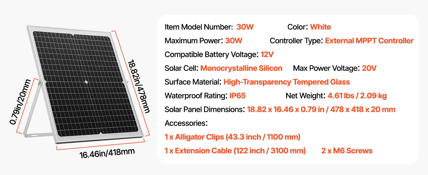 VEVOR 30W 12V Solar Panel Battery Charger, Solar Battery Trickle Charger Maintainer with Intelligent MPPT Controller & Adjustable Mount Bracket, IP67 Waterproof for Car Boat RV Motorcycle Trailer