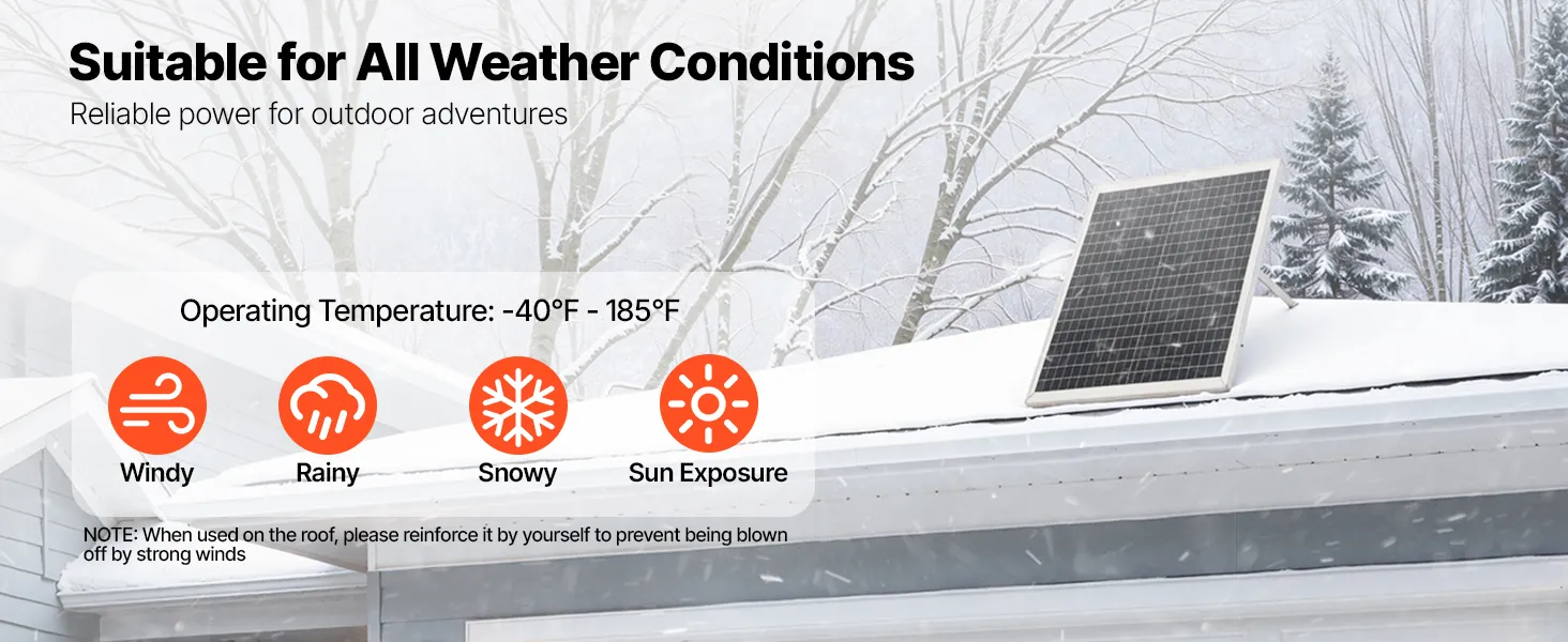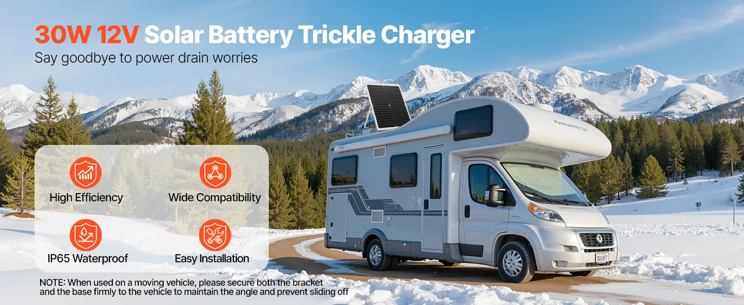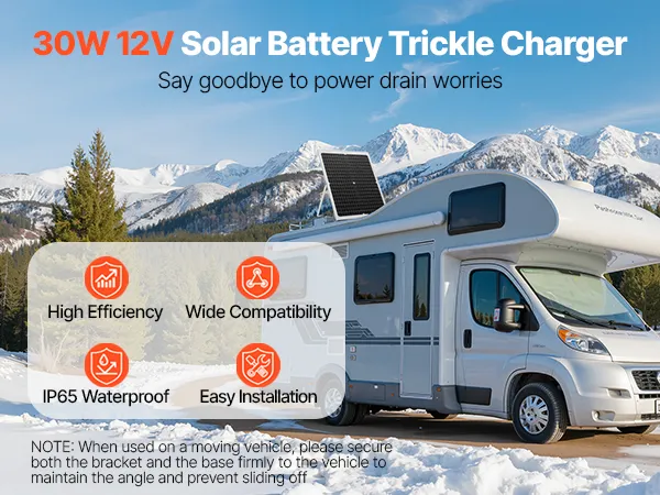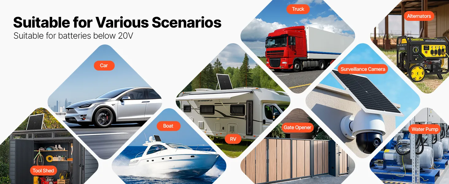 This solar battery charging kit is compatible with various 12V batteries, providing a reliable solution for batteries charging. (When used on a moving vehicle, please secure both the bracket and the base firmly to the vehicle to maintain the angle and prevent sliding off)