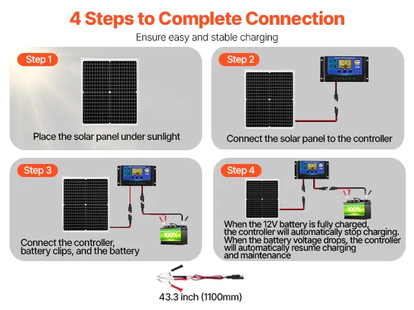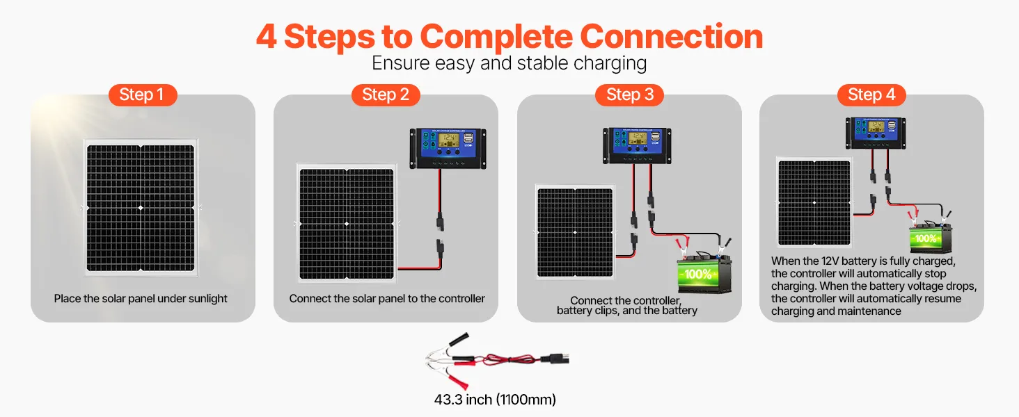 This solar panel battery charger comes with a 122-inch (3.1 m) extension cord and 43.3-inch (1.1 m) alligator clips. Simply connect to your 12V battery for quick charging.