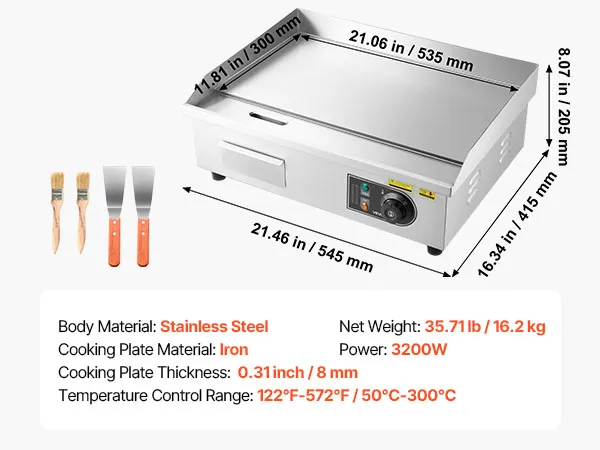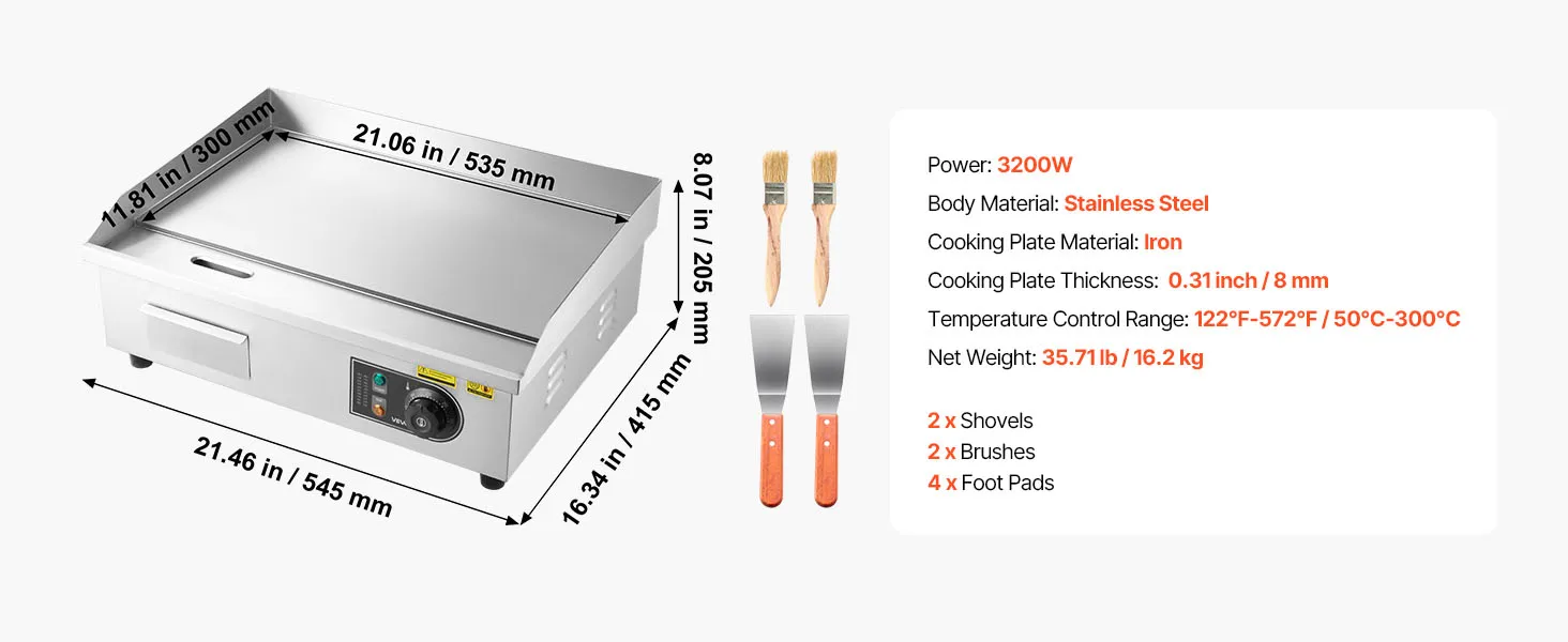 VEVOR Commercial Electric Griddle, 535 x 300 mm, 3200W, 50-300°C Adjustable Temp Control, Stainless Steel Countertop Flat Top Grill with 2 Spatulas, 2 Brushes and 4 Foot Pads, for Steak, Pancake