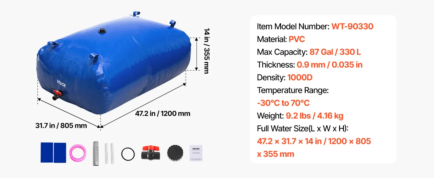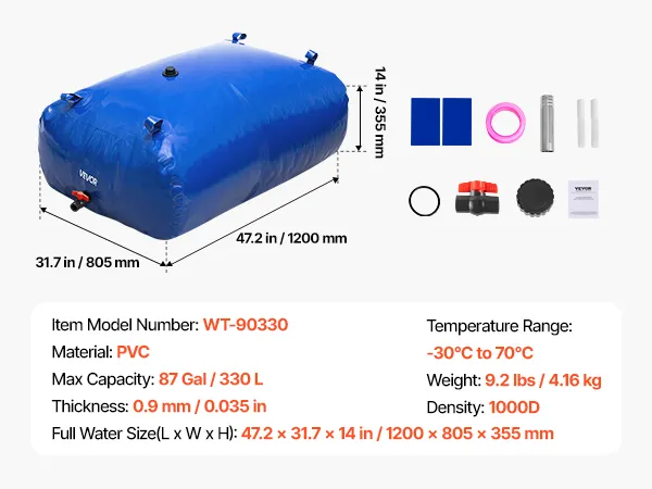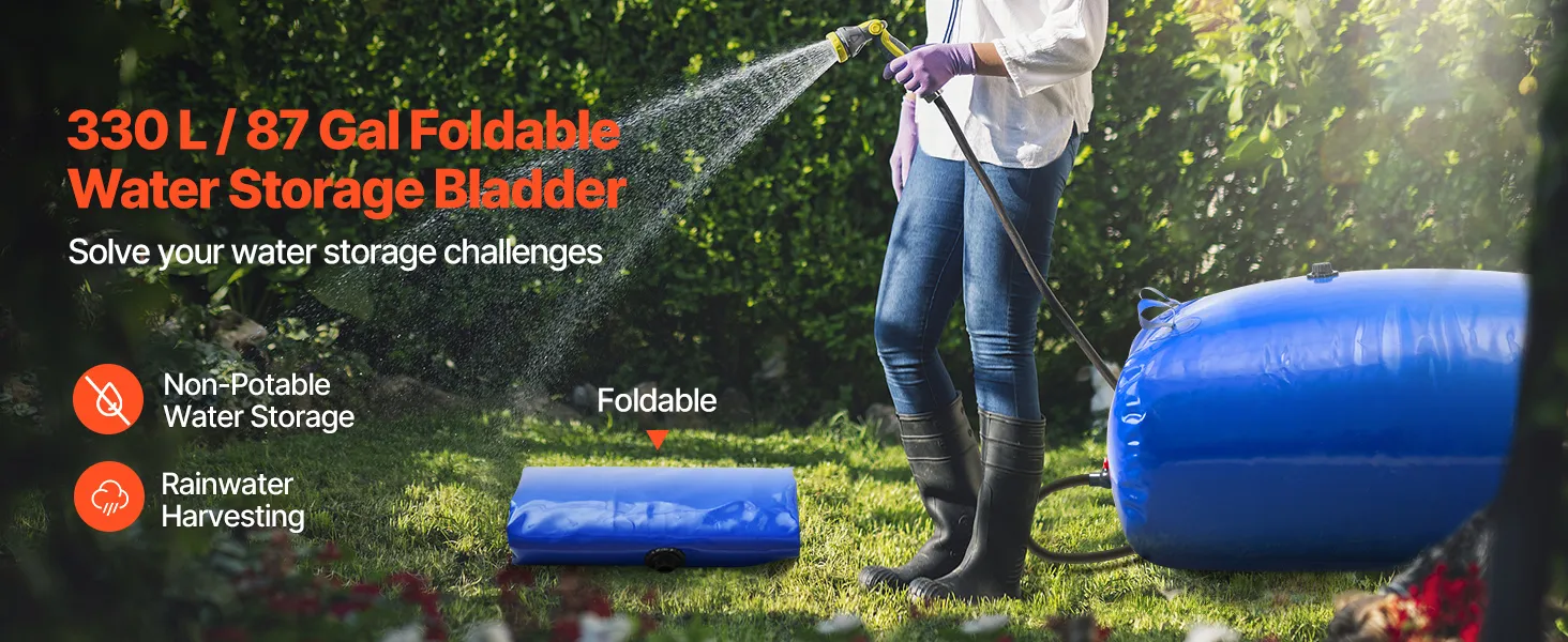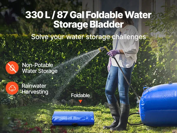 This VEVOR 87-gallon (330L) collapsible water storage bladder is crafted from tough 1000D double-layer PVC material, providing superior durability. Its leak-proof construction ensures reliable water storage for outdoor adventures, home use, gardening, or emergencies.