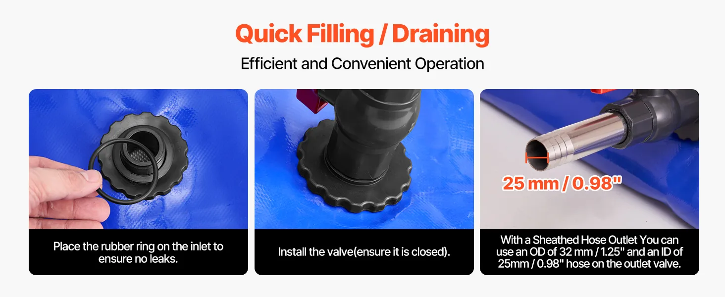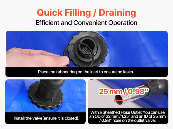 Our collapsible water storage container features large-diameter inlets and outlets, ensuring smooth water flow and easy compatibility with various hoses and high-pressure cleaners. Perfect for home use, camping, and other outdoor activities.