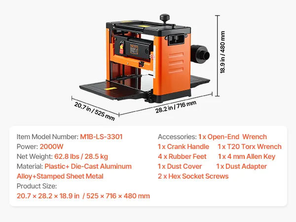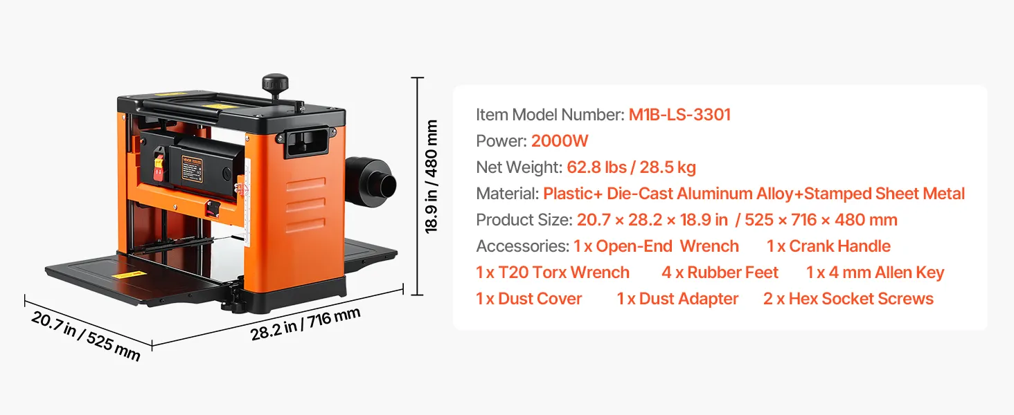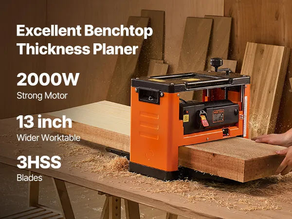 Designed for DIYers and small workshops. This woodworking planer machine features a dual-roller feed system, a powerful motor, 1/8-inch precise depth control, and millimeter-level accuracy. It ensures smoother cuts and easily handles thick hardwoods. Built-in dust ports keep your space clean.