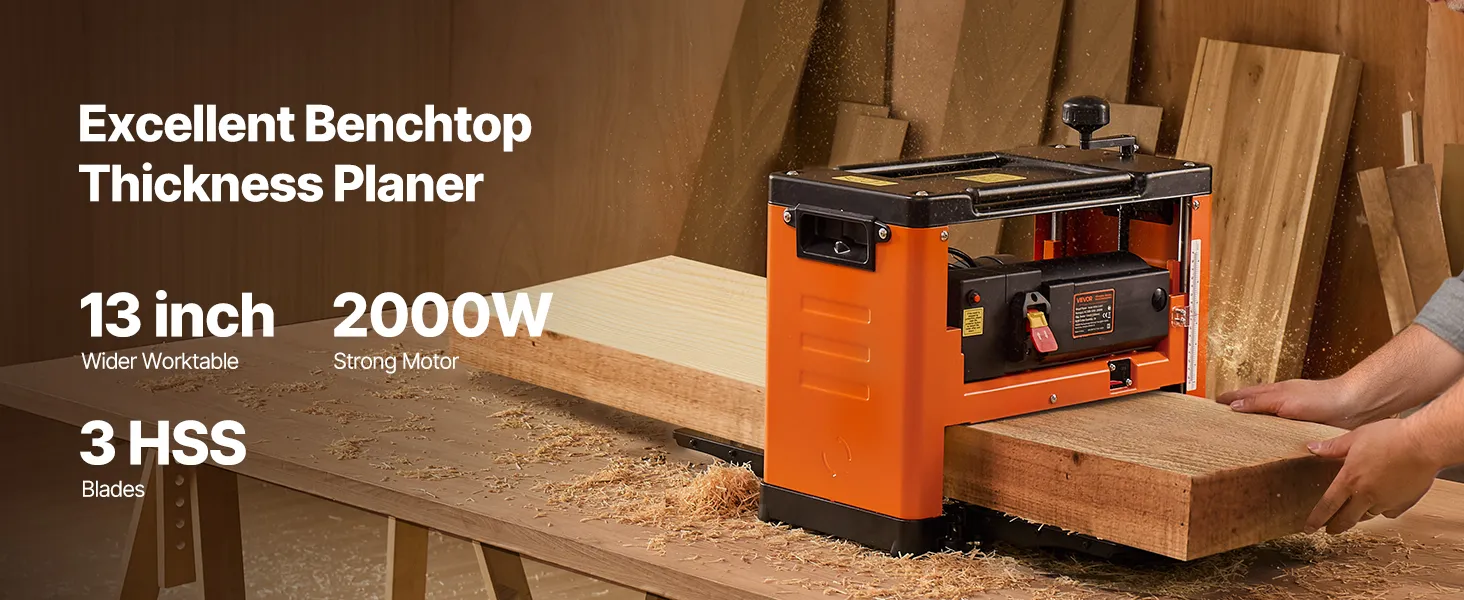 VEVOR Thickness Planer, Three-Blade, 330 mm Width Worktable Power Benchtop Planer, 2000W 23500 RPM Powerful Motor, Dual Rollers, Over Protection, Single Speed Woodworking, for Hard Soft Wood Material