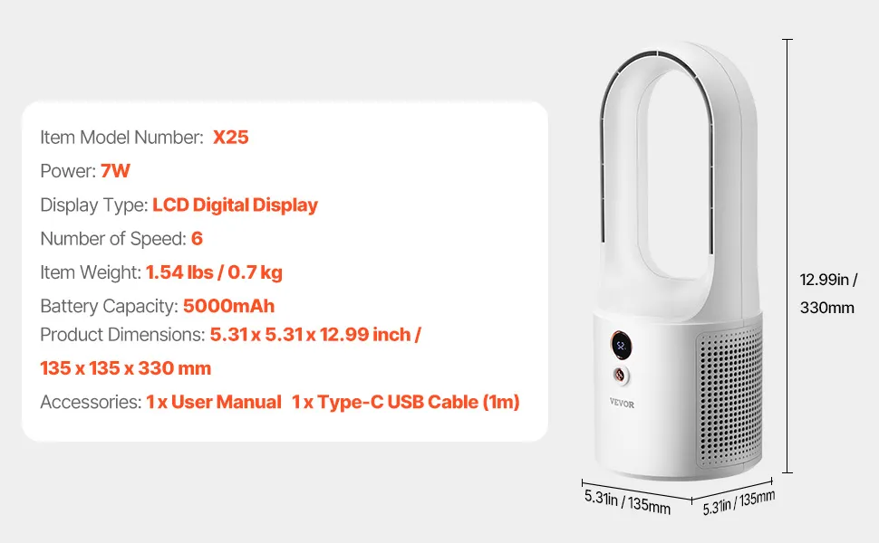 VEVOR Безлопастной Настольный Вентилятор 33см, 6 Скоростей, USB, 5000мАч, Тихий и Портативный, Безопасен для Детей, Дом и Офис