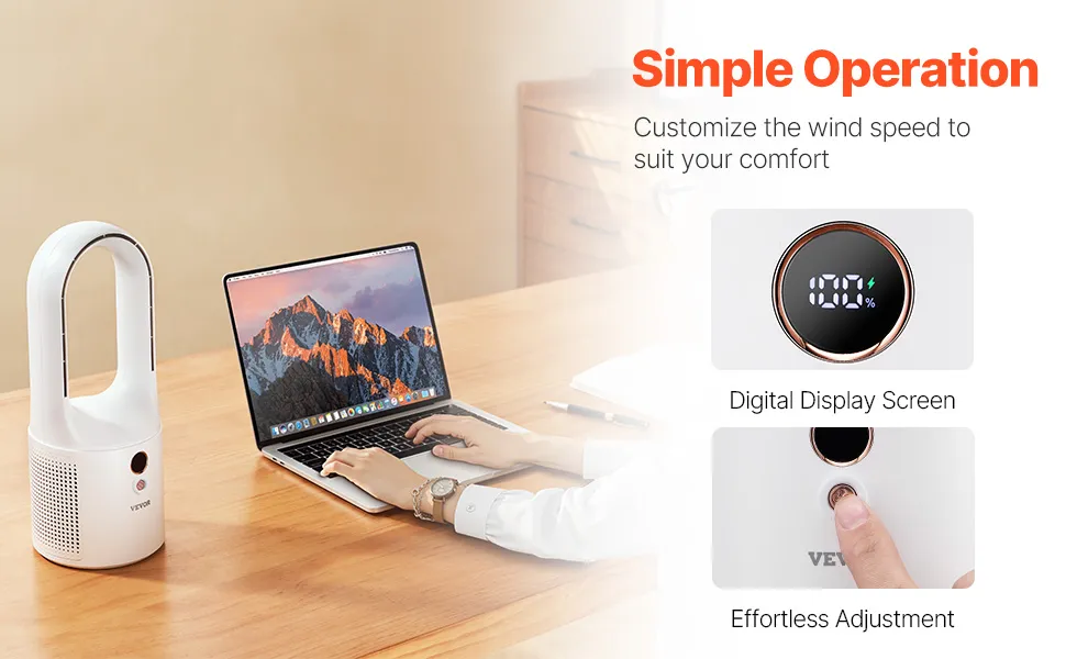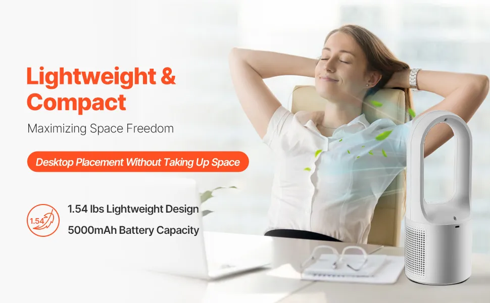 • Lightweight & Compact: With an ultra-lightweight design of just 1.54 lbs with a 5000mAh built-in battery, this portable bladeless fan is easy to move and fits into any corner without taking up space. Ideal for flexible layouts and constant cooling wherever you need it.