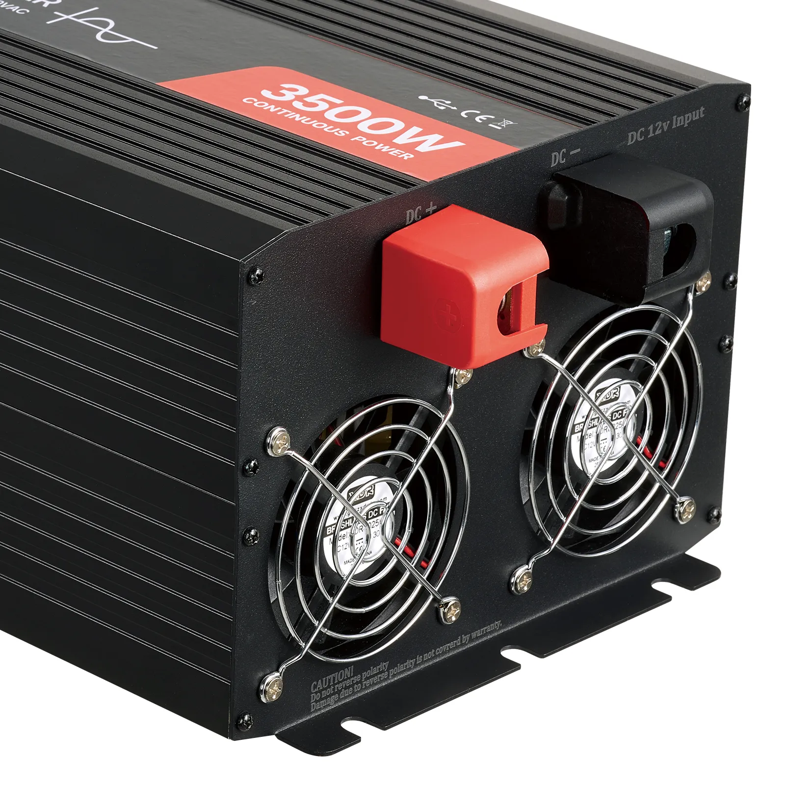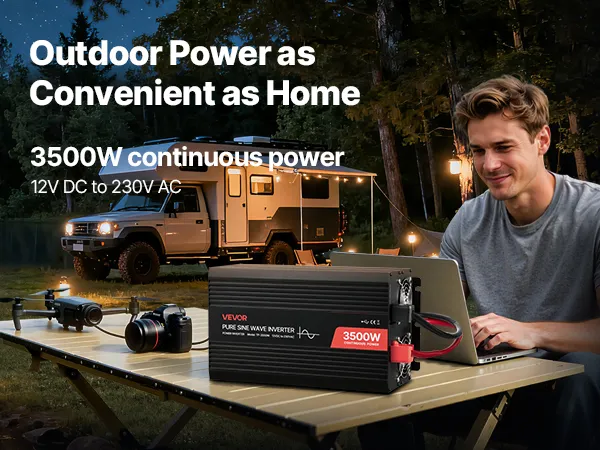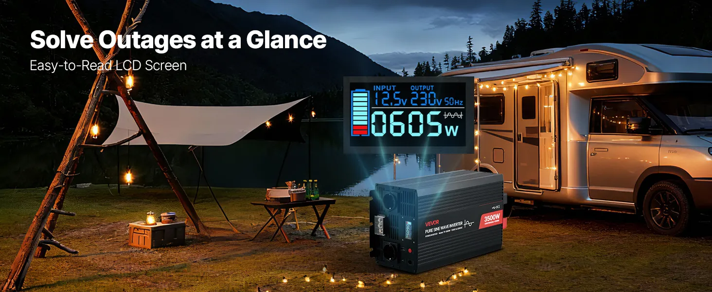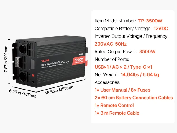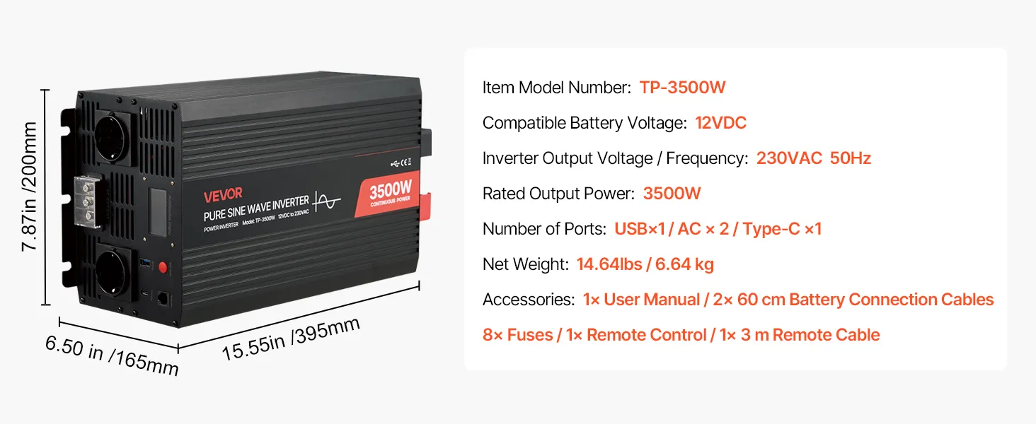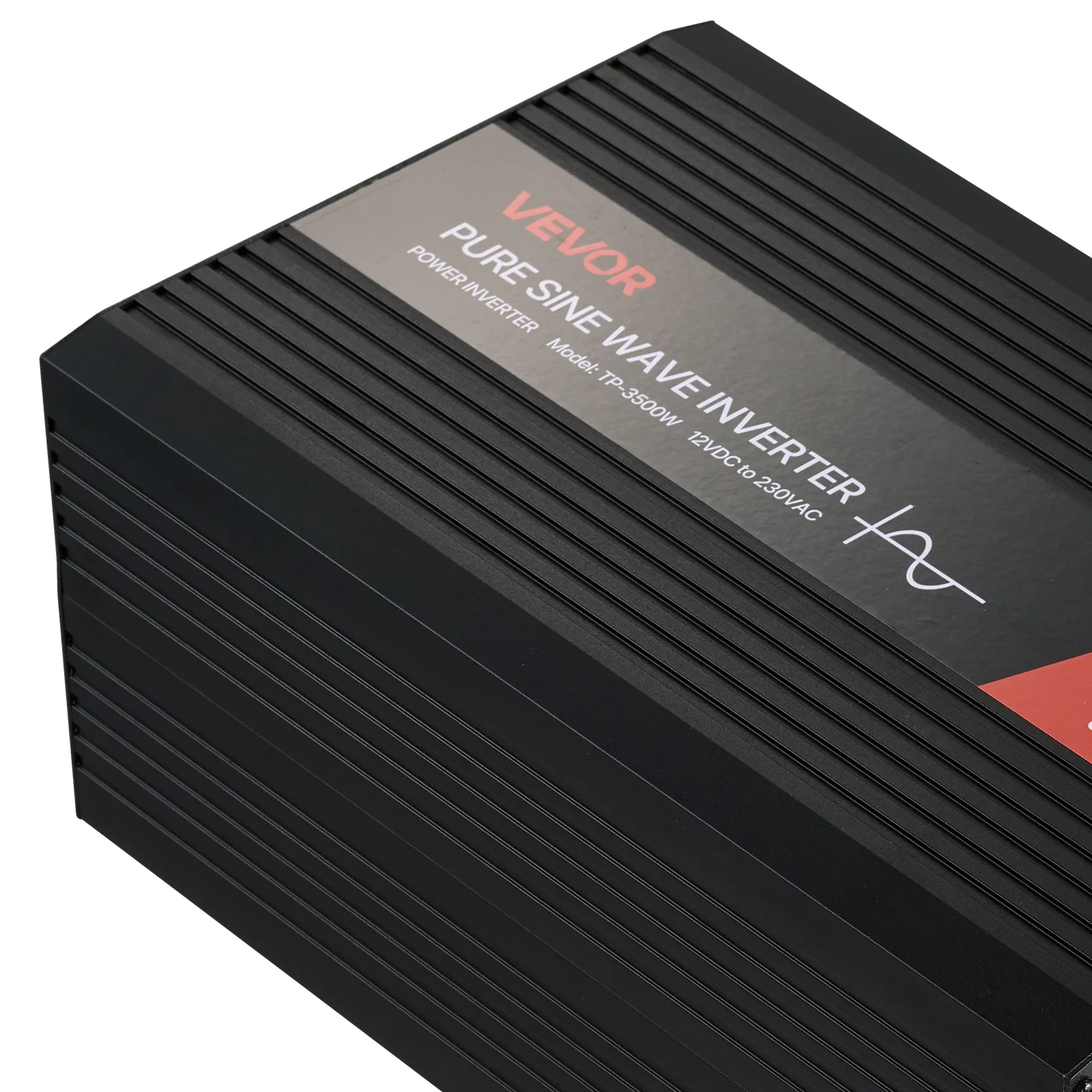 VEVOR 3500W Power Inverter, 12V DC to 230V AC Pure Sine Wave Inverter, Solar Car Charger Converter with LCD Display, Remote Control, USB Port, 2 AC Outlets, Type-C Port, for RV, Truck Outdoor Camping