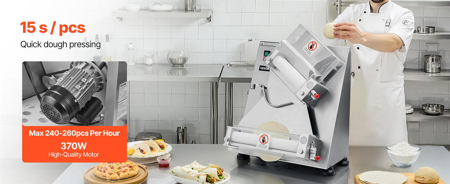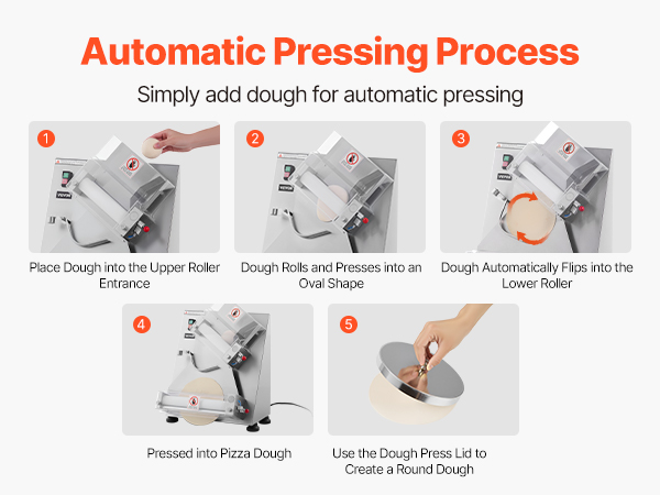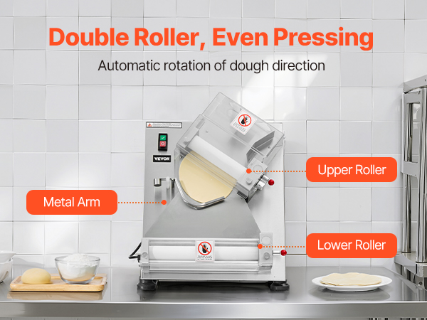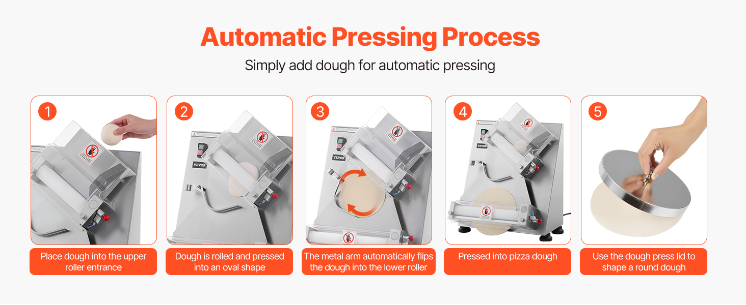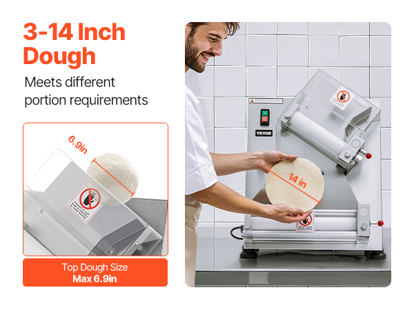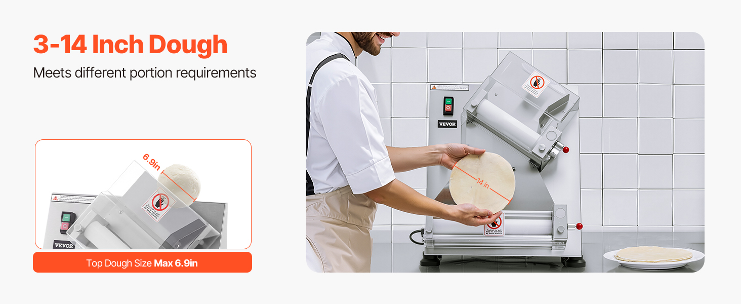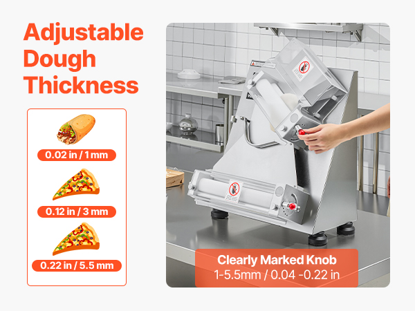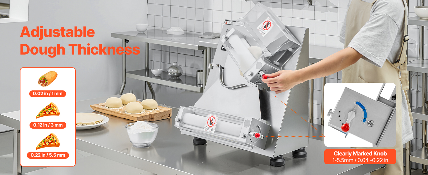 Электрический валик для теста для пиццы может прессовывать тесто размером от 3 до 14 дюймов с регулируемой толщиной (1-5,5 мм / 0,04 - 0,22 дюйма). Вы можете легко настроить его для прессования различных типов теста.