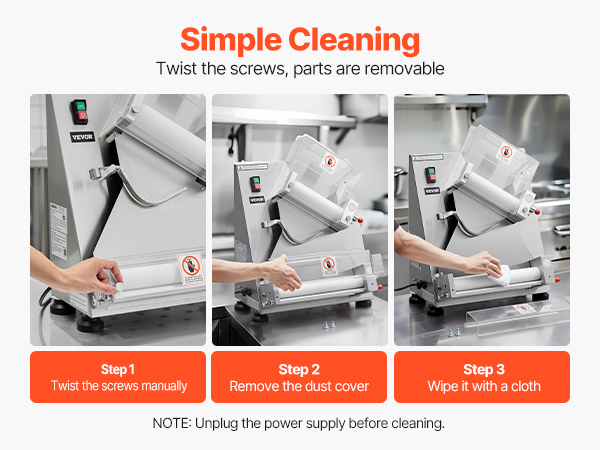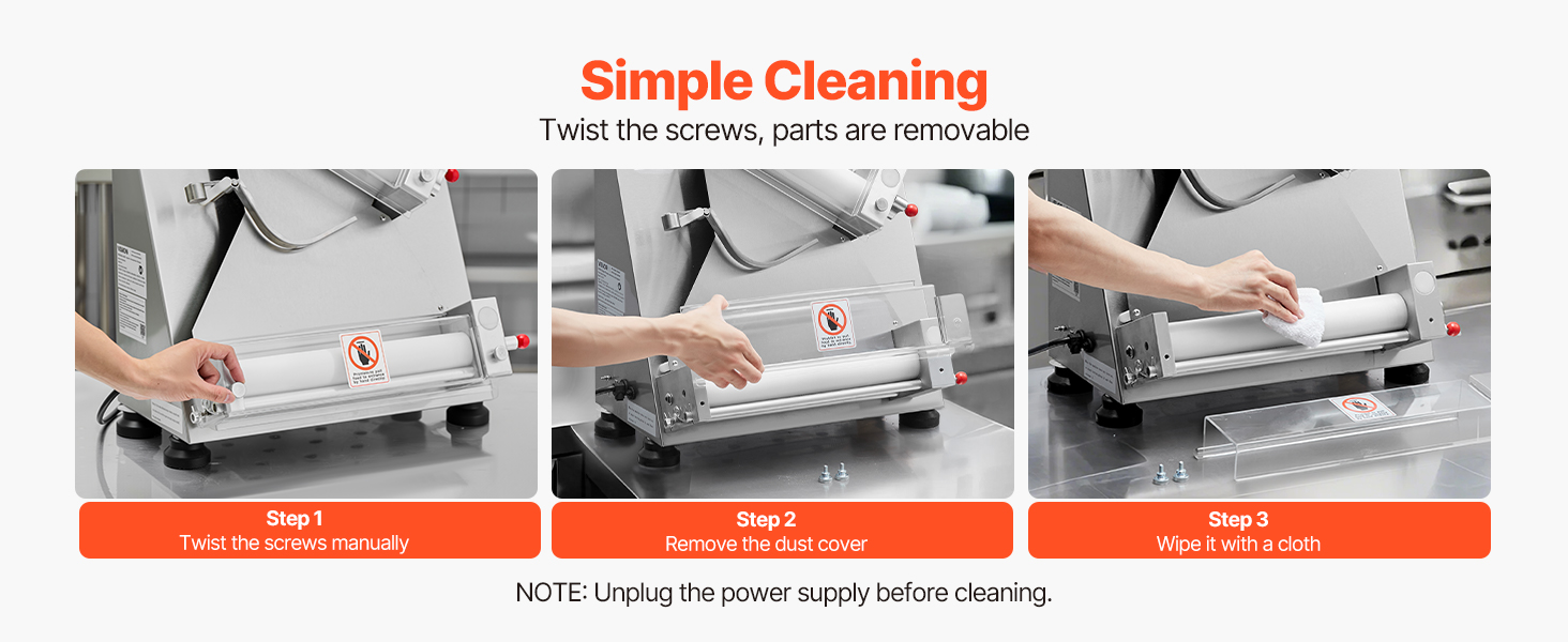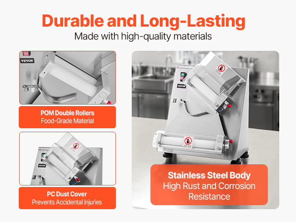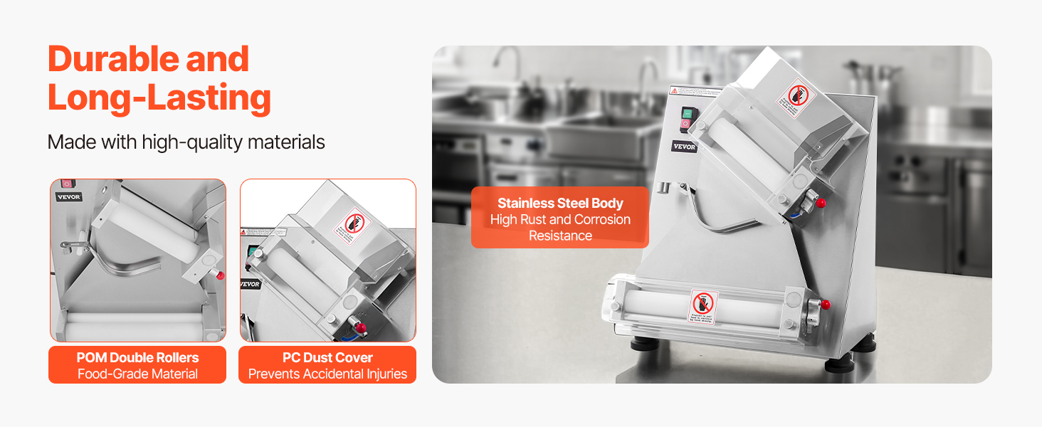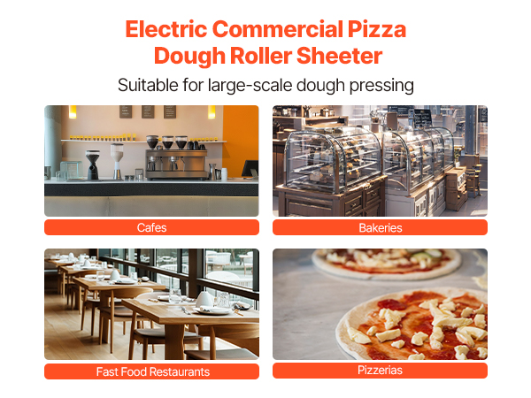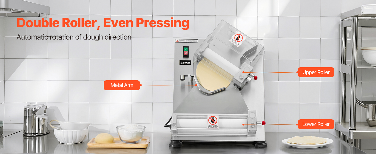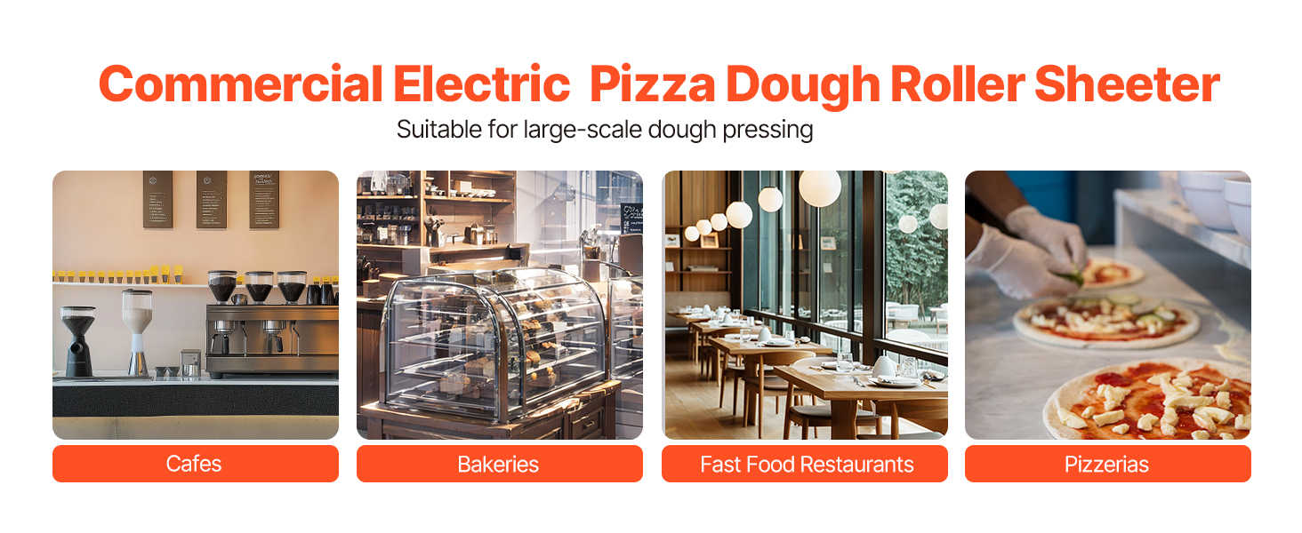 Электрический валик для теста для пиццы может прессовывать тесто размером от 3 до 14 дюймов с регулируемой толщиной (1-5,5 мм / 0,04 - 0,22 дюйма). Вы можете легко настроить его для прессования различных типов теста.