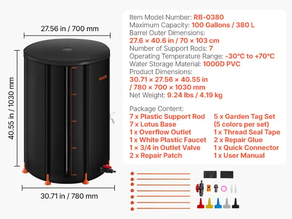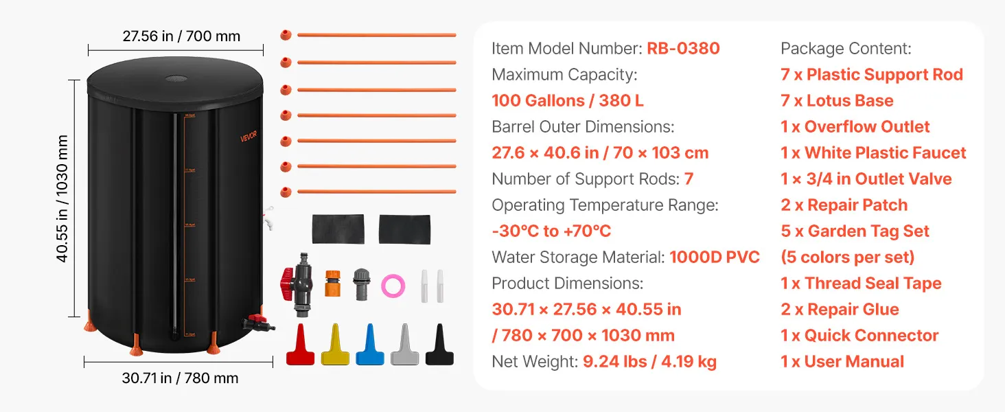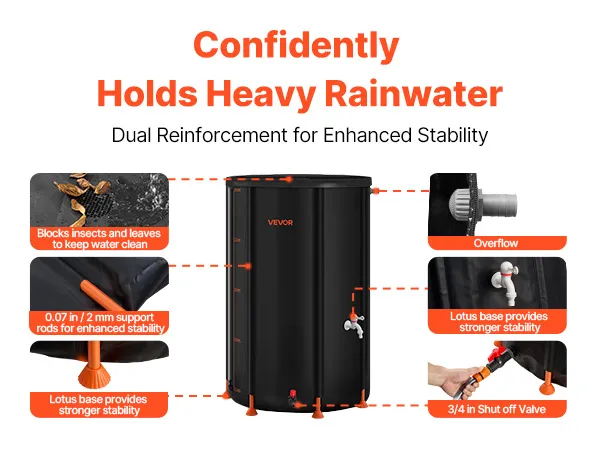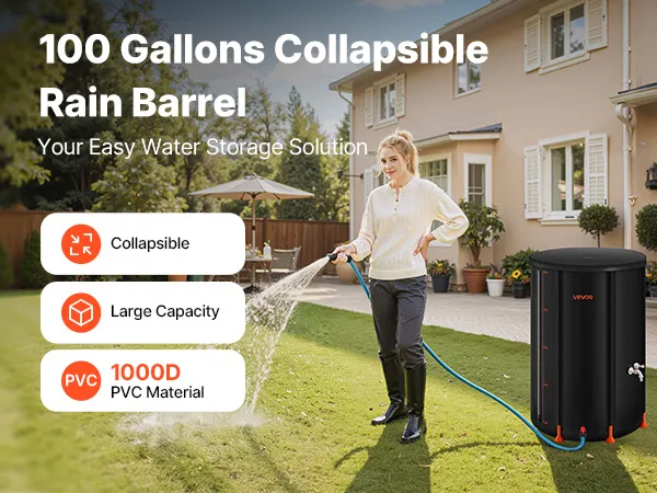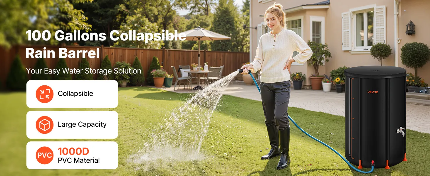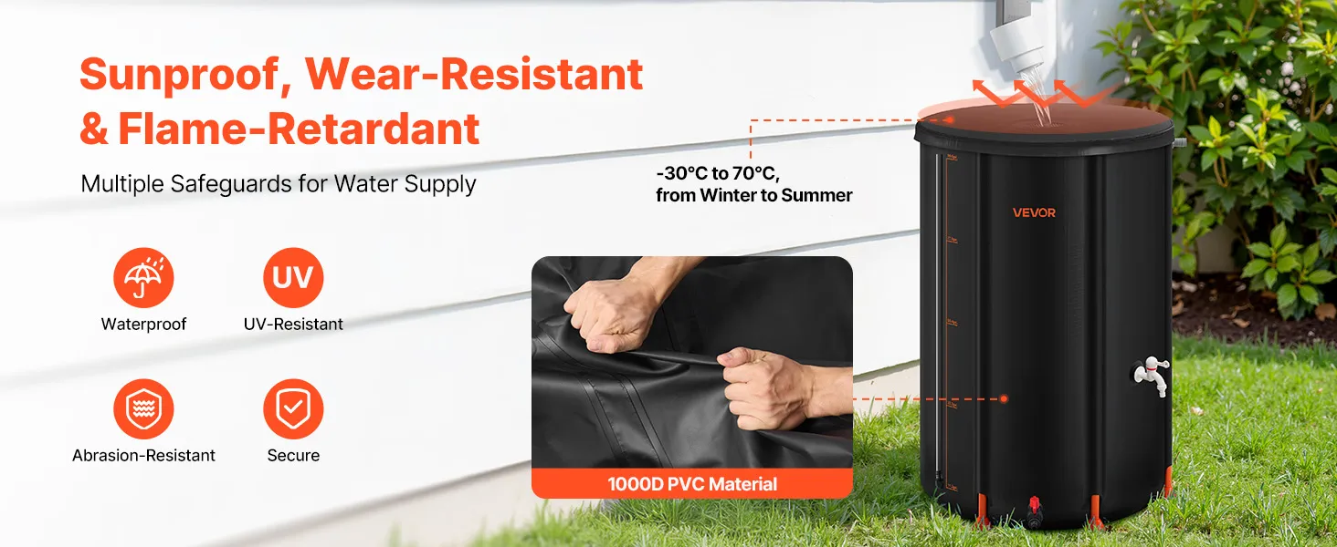 Our collapsible rain barrel, made of 1000D PVC, offers durability and convenience. It features a lotus base, 2 mm support rods, mesh top, pre-installed outlet, acrylic gauge, and quick setup. Foldable for compact storage, it’s ideal for home, garden, farm, and emergency use.
