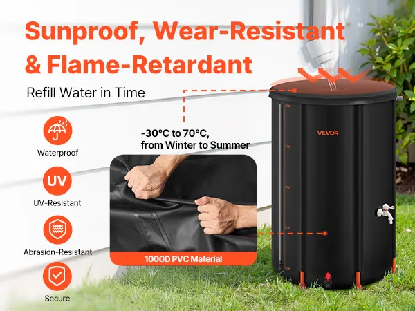 This collapsible water barrel is crafted from 1000D PVC, offering rainproof, UV-blocking, wear-resistant, and non-toxic features. With a working temperature range of -30℃ to +70℃, it performs reliably in both hot summers and freezing winters.