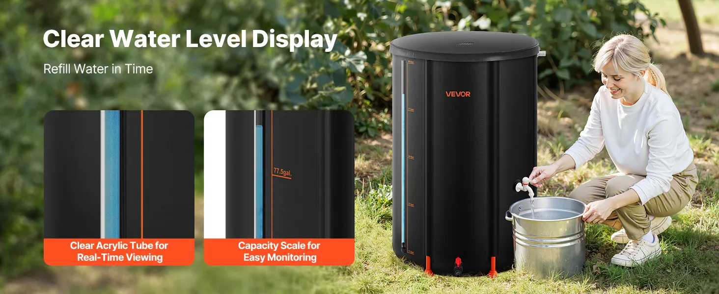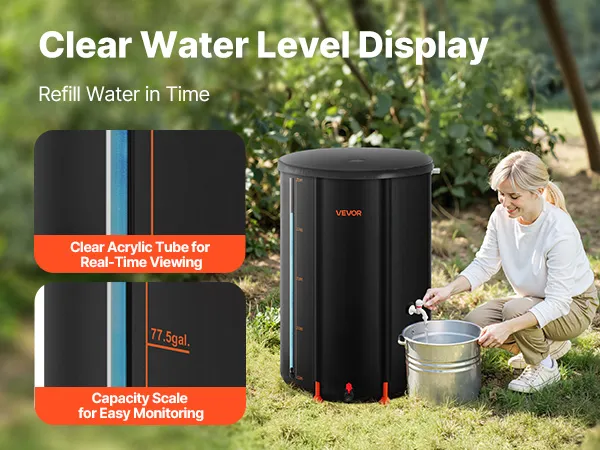 Our rain collection system features an acrylic transparent tube with clear markings, so you can check water levels anytime without opening the lid, refill in time, and avoid running out when water is needed most.