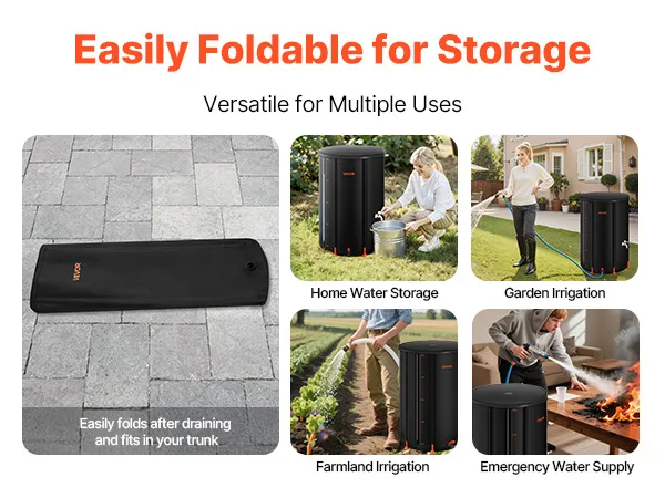 After draining, this rain barrel folds into a compact size for storage in small spaces like a car trunk. Its versatility makes it ideal for household storage, garden irrigation, farmland watering, or as an emergency water source.
