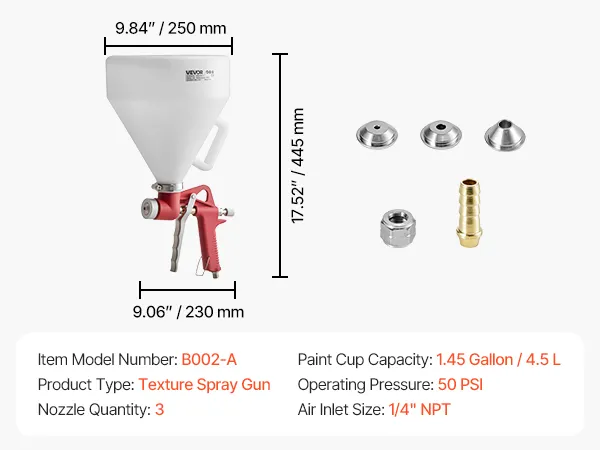 VEVOR Air Texture Spray Gun, 4.5L Air Hopper Spray Gun, Professional Drywall Texture Painting Sprayer with 3 Nozzles (3.5mm, 6mm, 8mm) for Popcorn, Knockdown, Orange Peel Textures