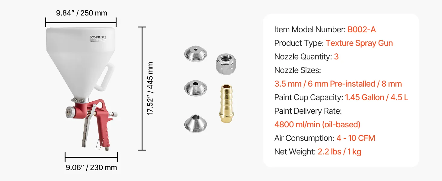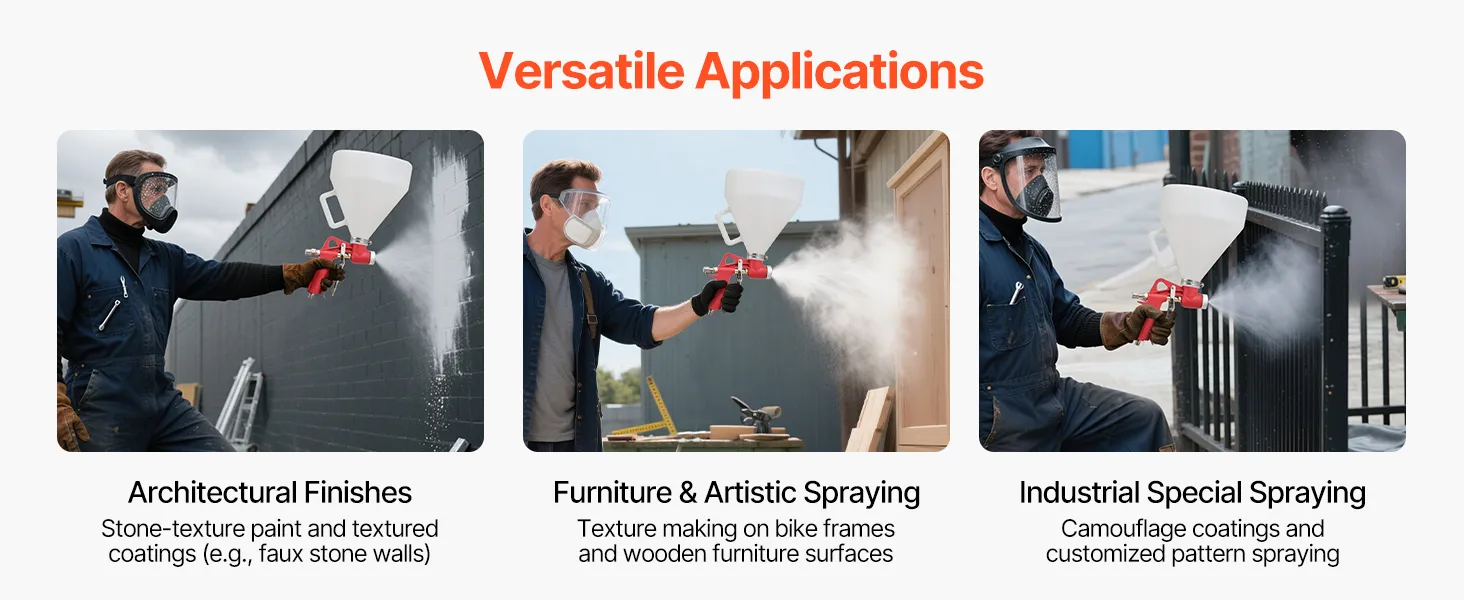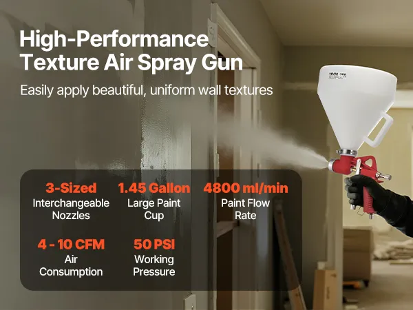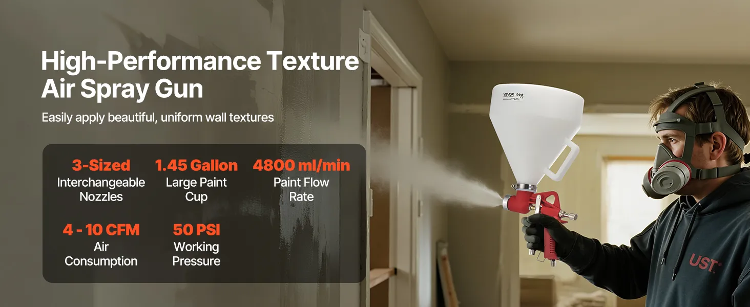 Want to give your walls and ceilings a fresh look? VEVOR air texture spray gun makes it easy! With 3 nozzles, adjustable paint flow, 1.45-gallon large-capacity hopper, and precise control, you can quickly achieve various textures — popcorn, knockdown, and orange peel.
