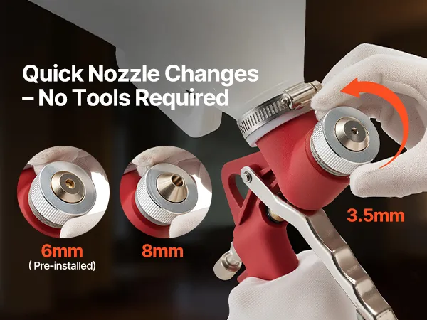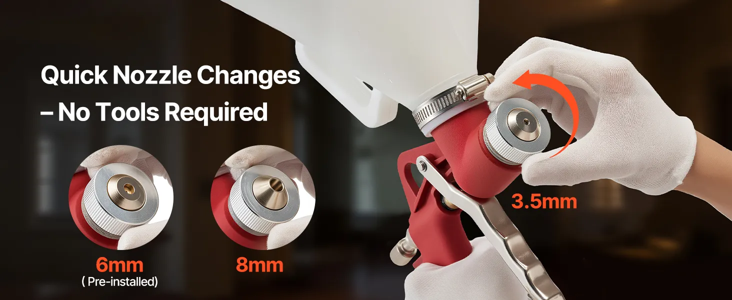 3.5mm nozzle is ideal for fine spraying and thin coatings, the 6mm nozzle is suitable for medium-thickness spraying, and the 8mm nozzle is perfect for fast application and heavy texture coatings.