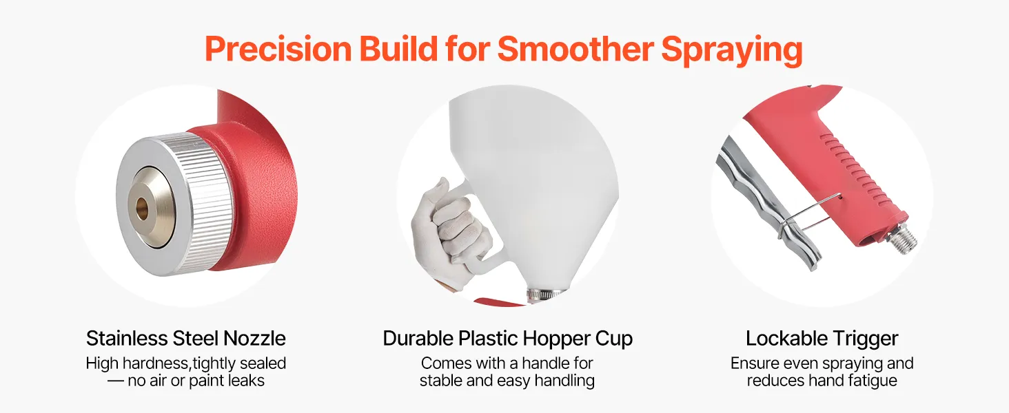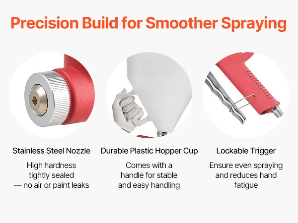 Stainless steel nozzles with a tight seal prevent air and paint leaks; the durable hopper cup with a handle ensures a steady grip. The lockable trigger delivers more uniform spraying and reduces hand fatigue.
