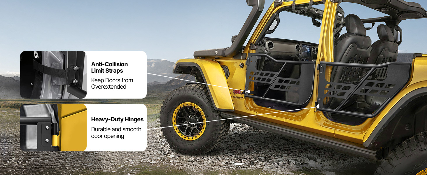 Наши трубчатые двери Jeep - идеальное решение для путешествий на свежем воздухе. Разработанные с учетом заводских петель и защелок, они улучшают обзор, улучшают поток воздуха и делают вождение по бездорожью более отзывчивым и приятным.
