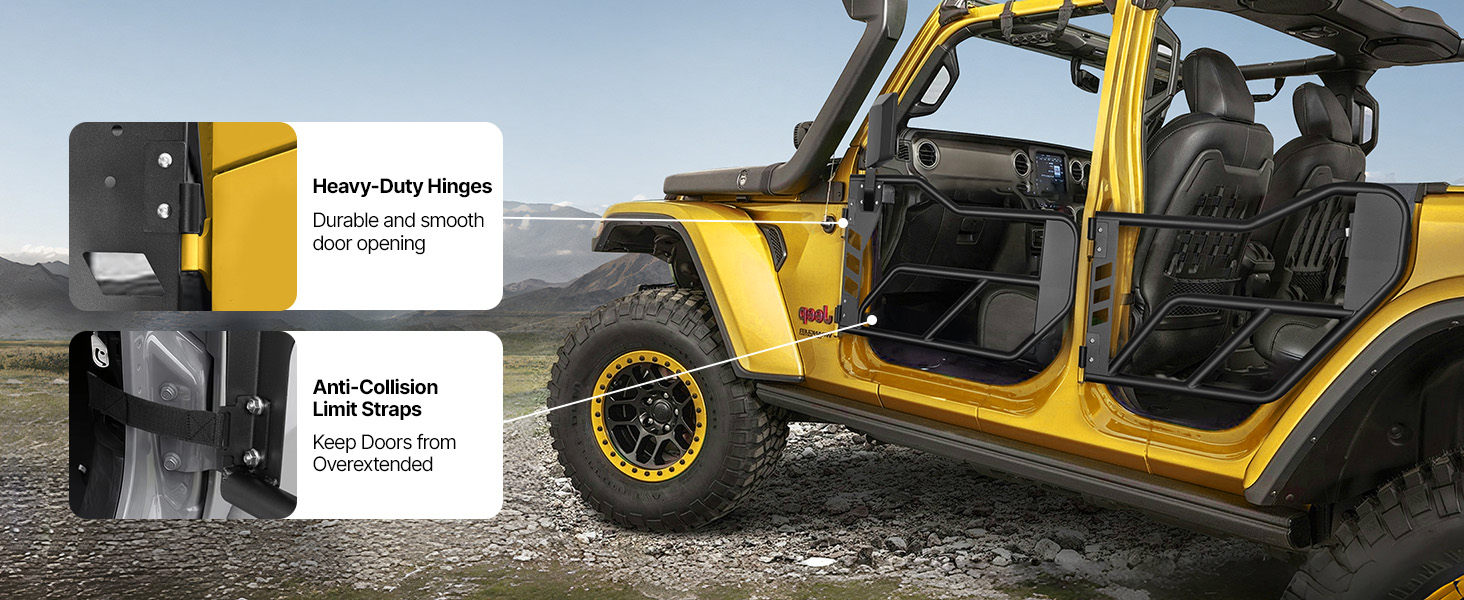 Наши трубчатые двери Jeep - идеальное решение для путешествий на свежем воздухе. Разработанные с учетом заводских петель и защелок, они улучшают обзор, улучшают поток воздуха и делают вождение по бездорожью более отзывчивым и приятным.