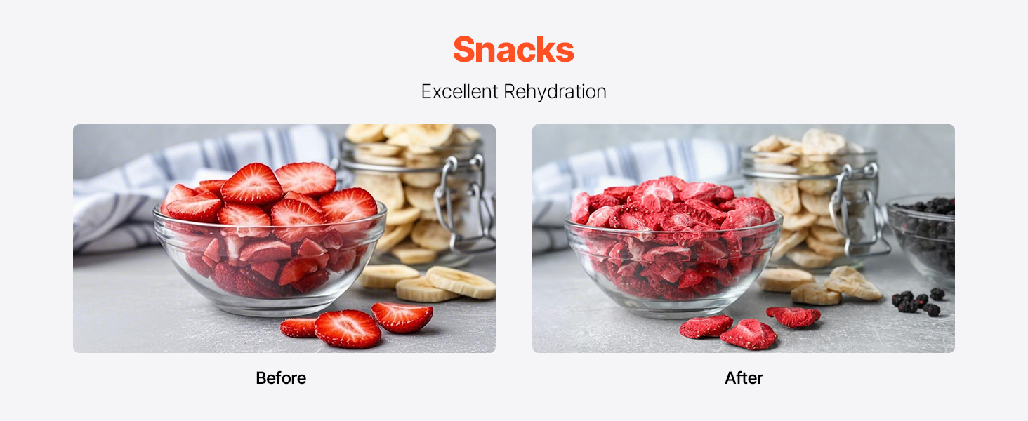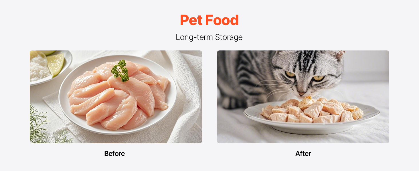 Сублимационная сушка подходит для фруктов, овощей, зерновых, мяса, цветочного чая, кормов для домашних животных и многого другого. Эта машина для сублимационной сушки широко используется в пищевой промышленности, производстве пищевых добавок и пищевых продуктов для наружного применения.
