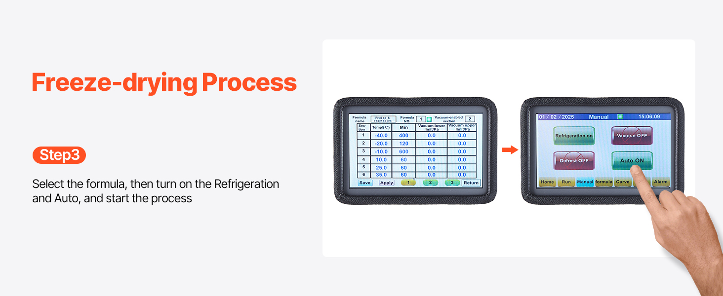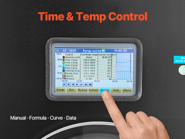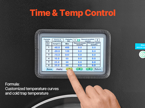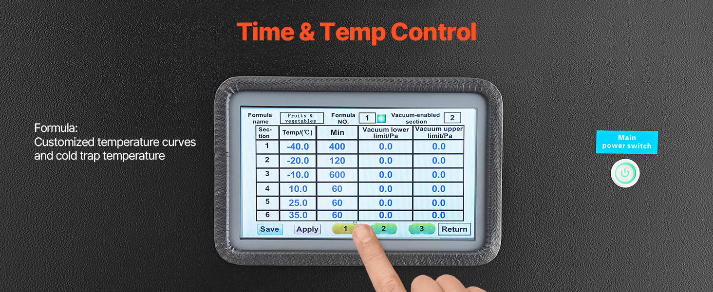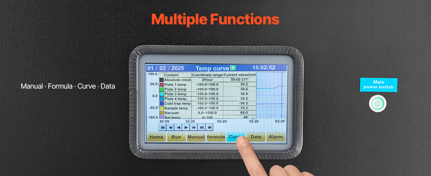 Сенсорный экран высокой четкости обеспечивает удобное управление с мощными функциями и сегментированными кривыми сушки для удовлетворения потребностей в сублимационной сушке различных материалов. Пожалуйста, убедитесь в использовании правильно заземленной электрической розетки при рабочей температуре окружающей среды ≤30°C.