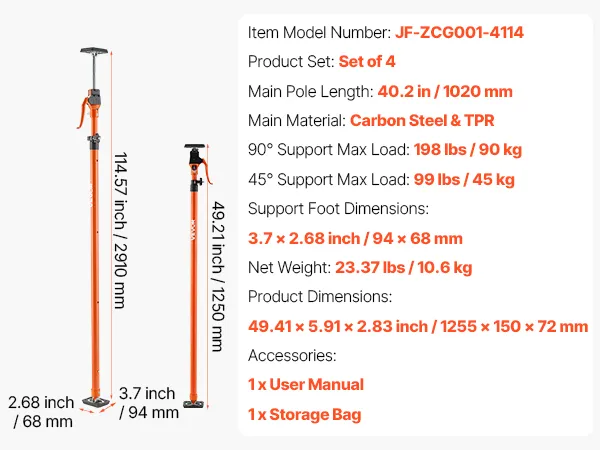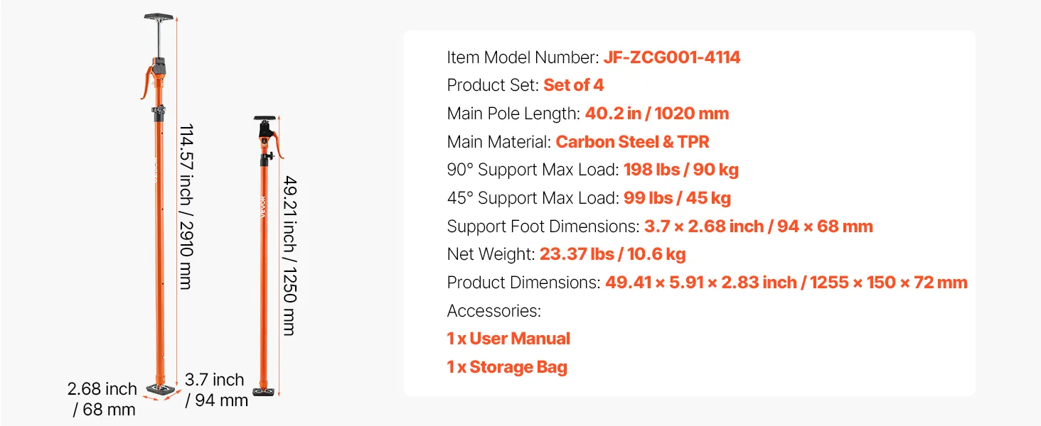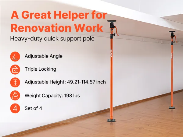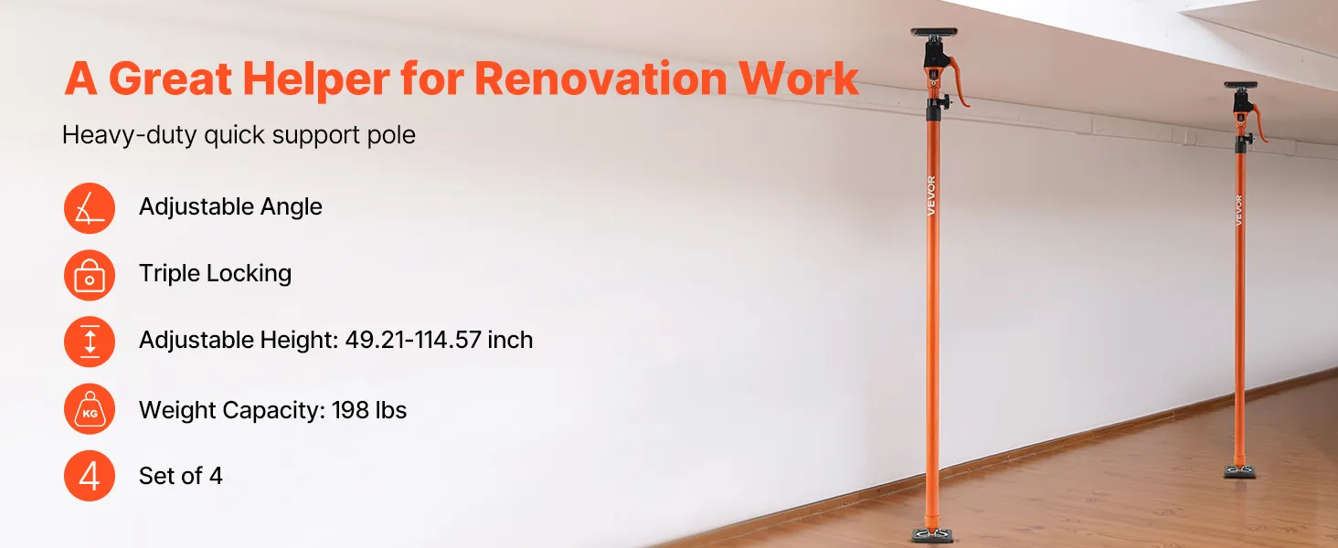 This 4-pack cabinet jack support pole set delivers efficient load support for jobsites, warehouses, and home projects. With a 198 lbs load capacity, adjustable height, and secure lock-in design, it's ideal for lifting or holding cabinets, drywall, and more.
