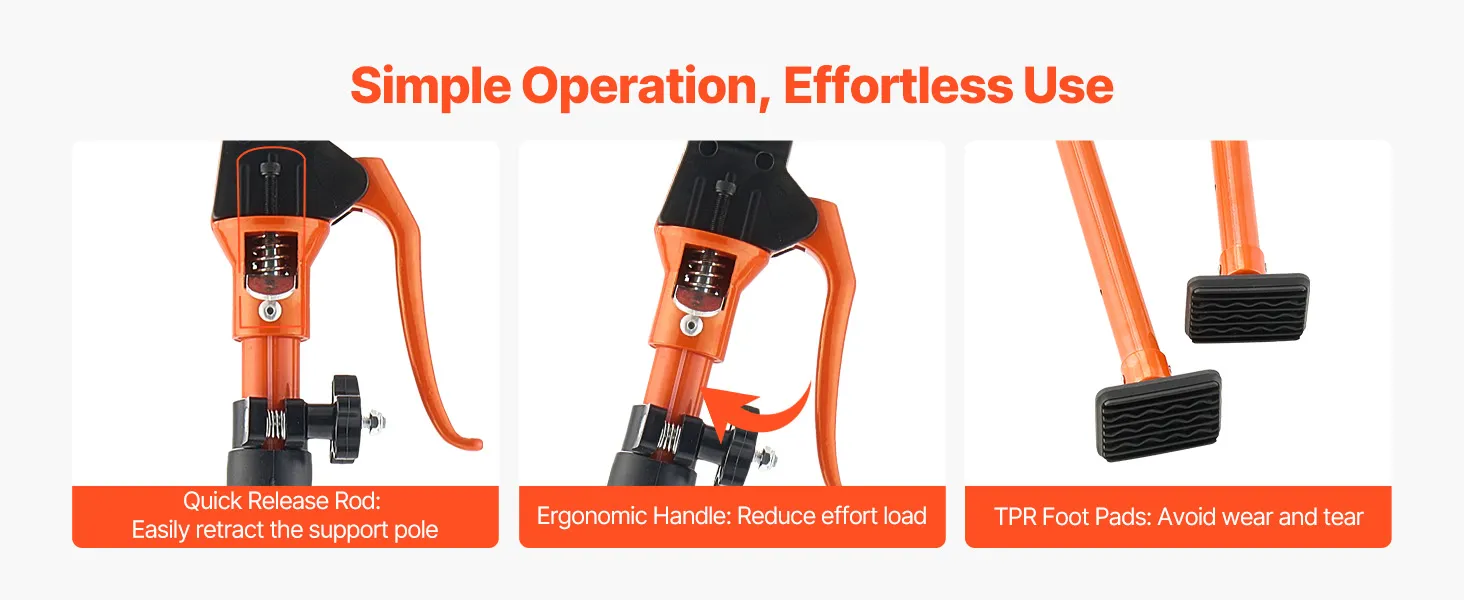 Ergonomic aluminum handle for easy control, quick-release button for fast retraction, and TPR foot pad of the cabinet jack to secure floors. Set up or take down without tools—ideal for one-person jobs.