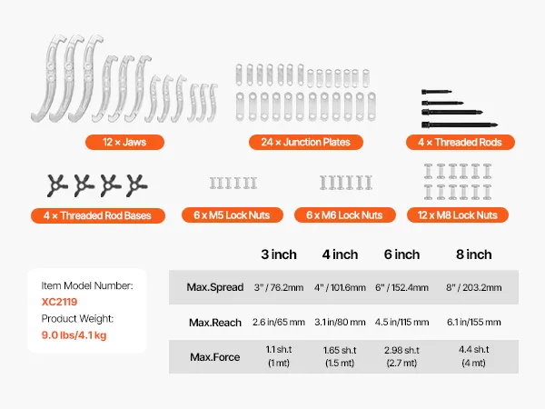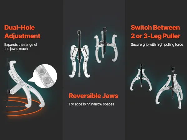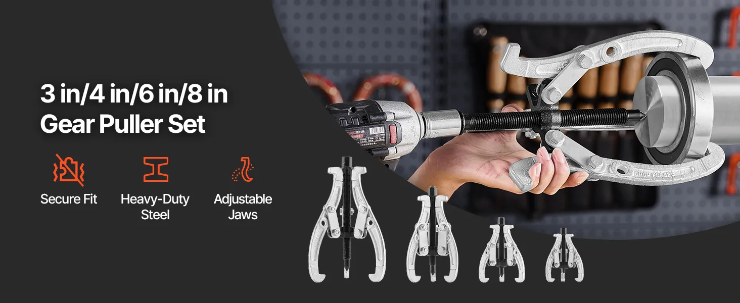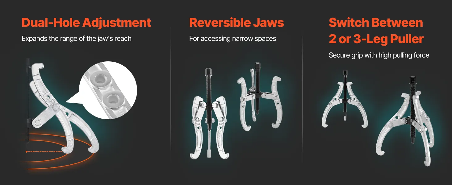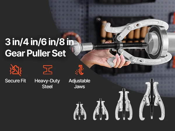 The gear puller set comes with 4 puller tools (3 in, 4 in, 6 in, 8 in). Its flexible jaw conversion allows for quick switching between 2-jaw and 3-jaw modes, providing increased pulling power and stability. Its reversible jaw design ensures a secure grip on both small and large components.