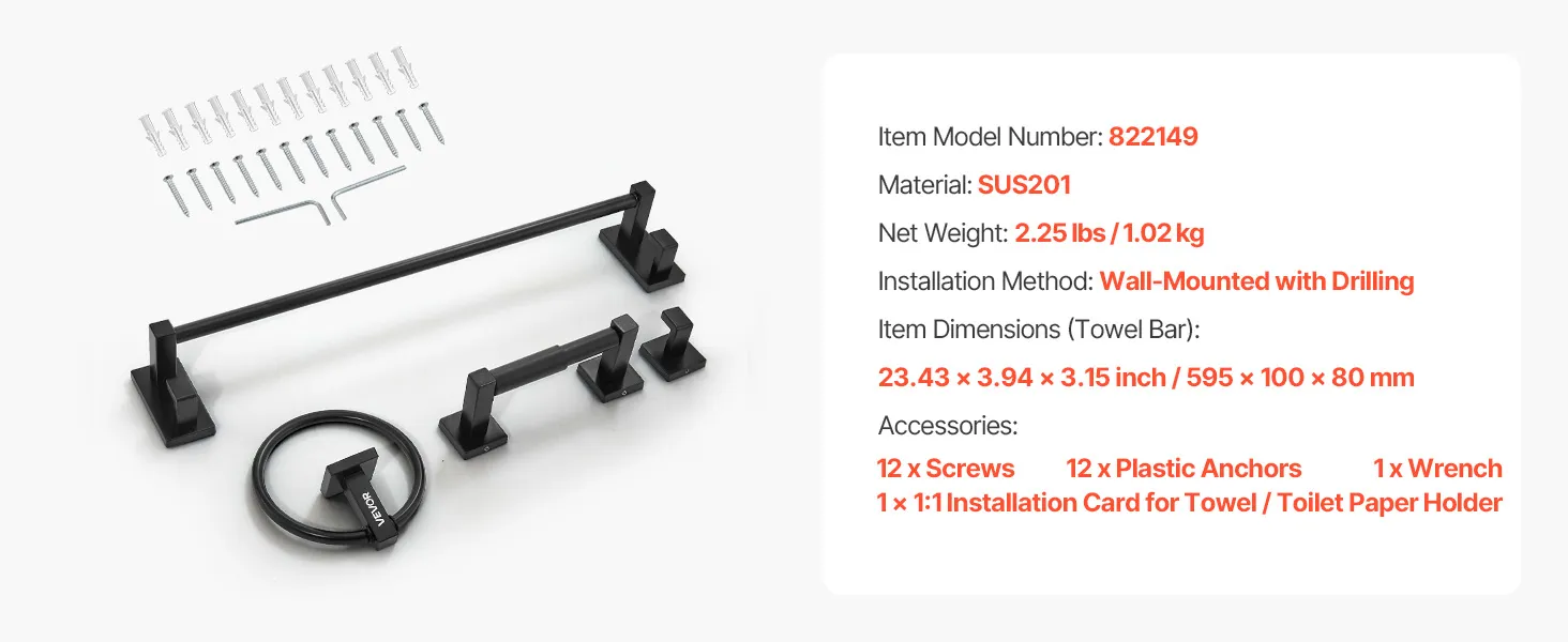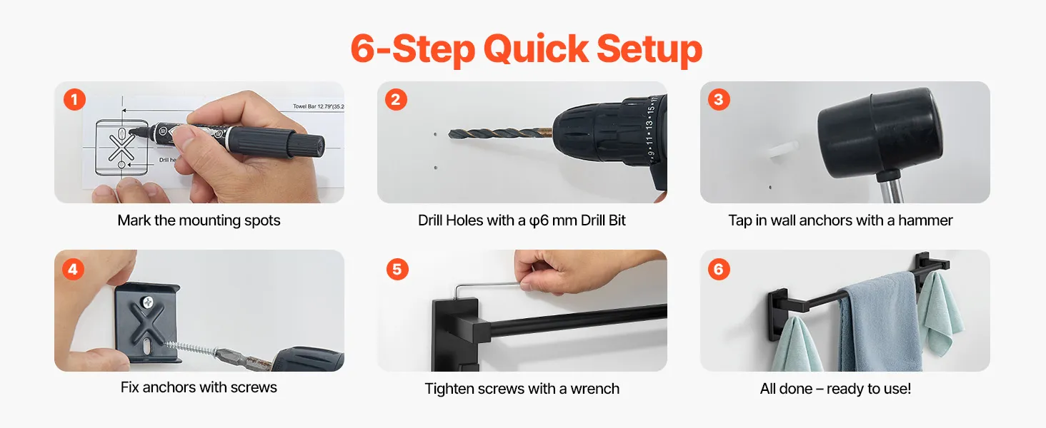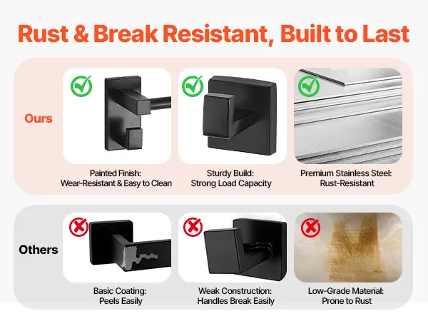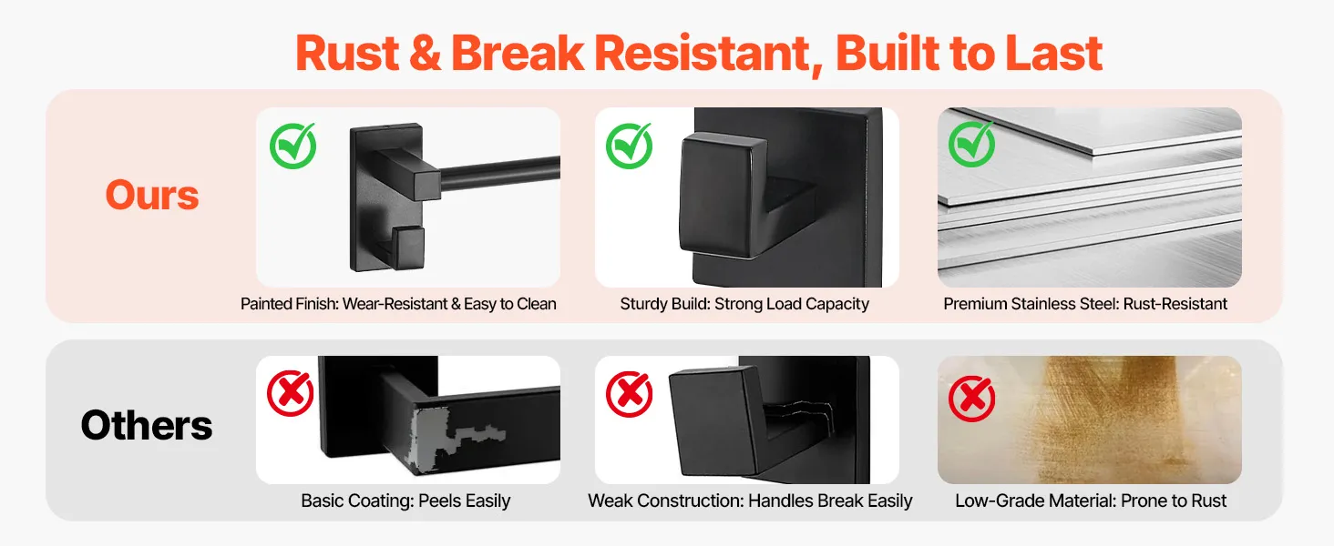 Our towel bar set is crafted from high-quality stainless steel that is wear-resistant, scratch-proof, and rust-resistant—ideal for damp bathroom environments and built to last.