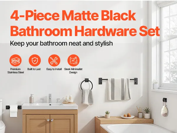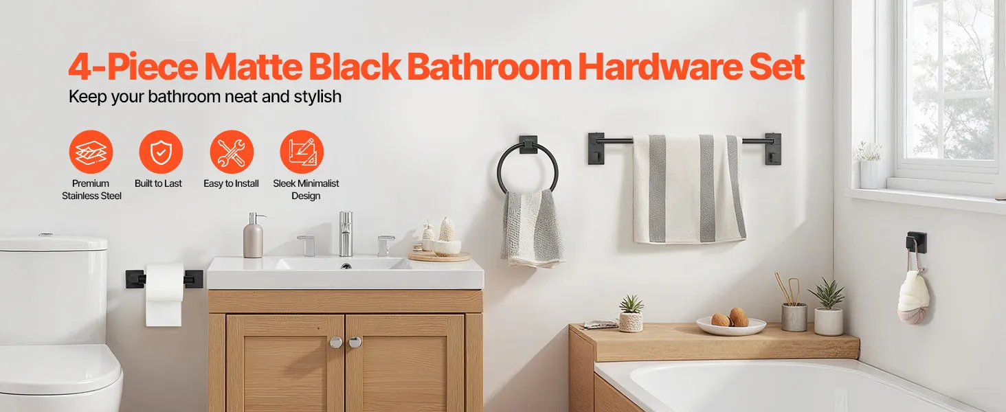 VEVOR Matte Black Bathroom Hardware Set, 4 Pieces Stainless Steel Bathroom Accessories Set, 24-inch Towel Bar, Towel Ring, Robe Towel Hook, Toilet Paper Holder, for Bath Room, Wall Mounted