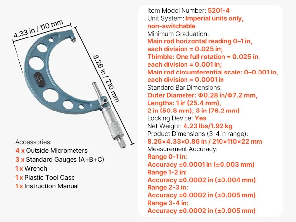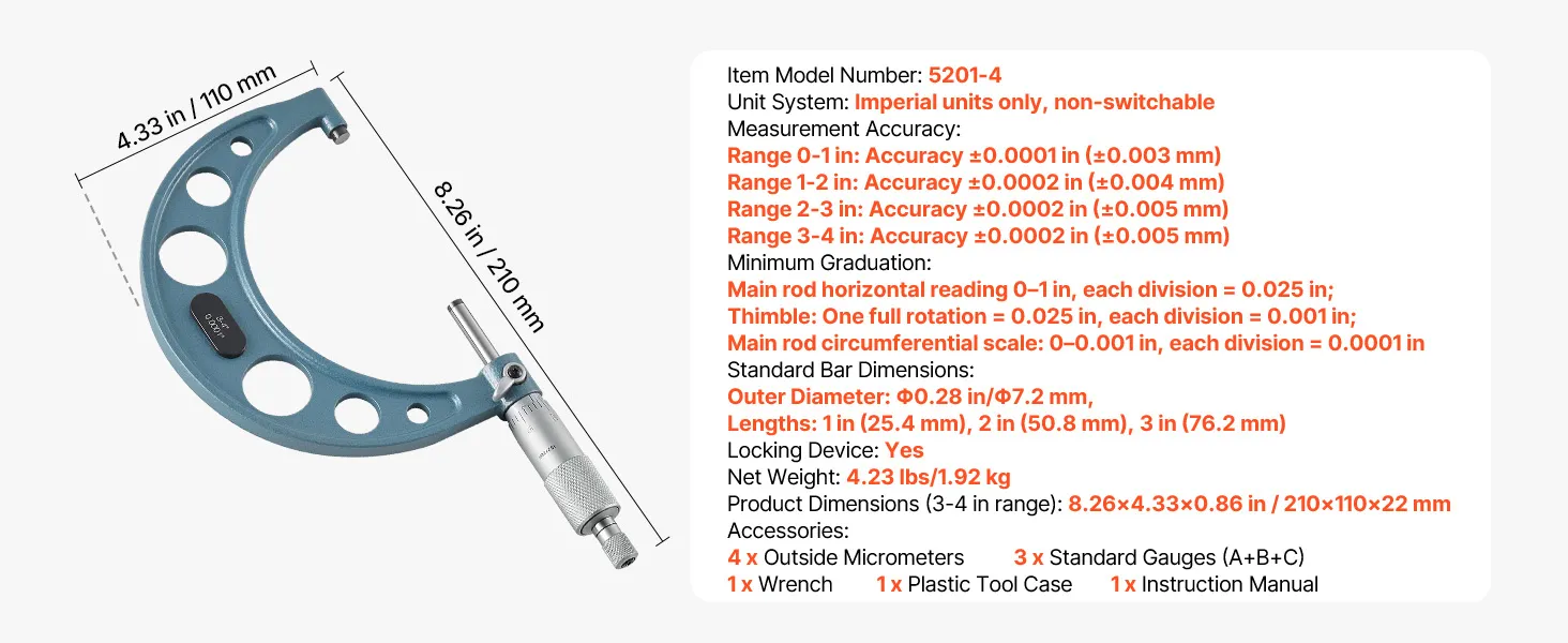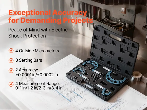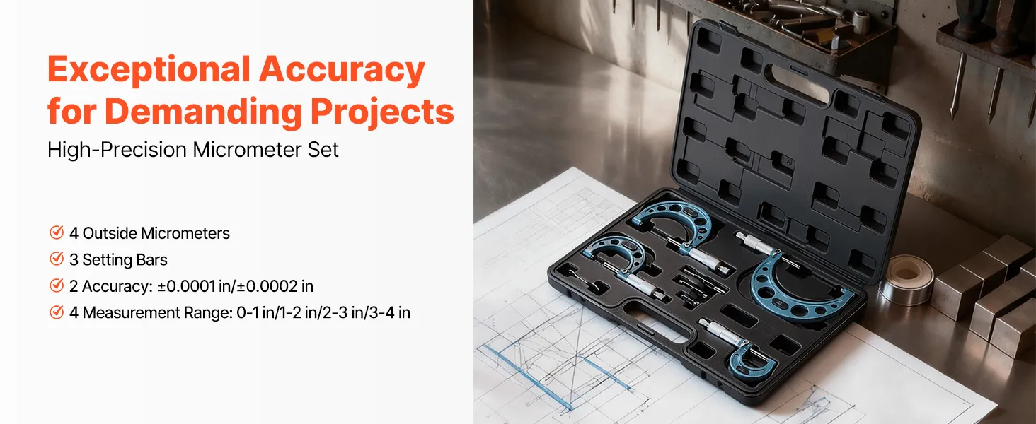 VEVOR 4 PCS Micrometer Set, 0–1/1–2/2–3/3–4 in Machinist Outside Micrometer, Ultra-Precision Accuracy, Professional Machinist Tools with Protective Case, for Metalworking & Engineering