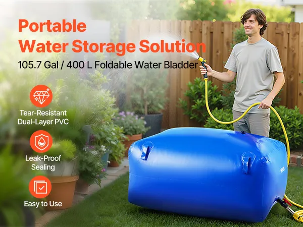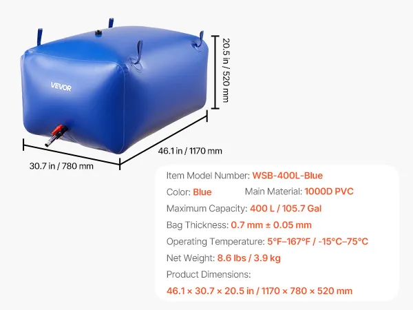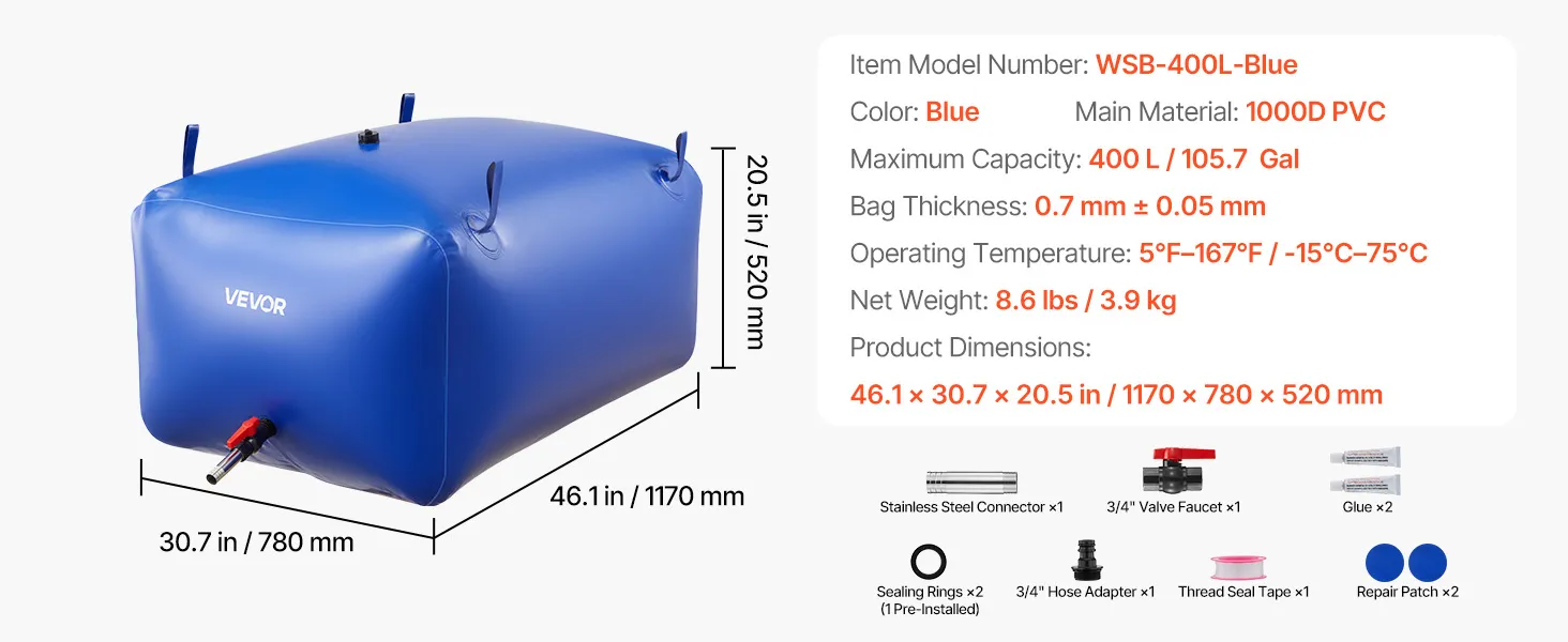 • 105.7 Gal Water Storage Bladder: This PVC water storage bladder measures 46.1 × 30.7 × 20.5 in and holds up to 105.7 Gal. Ideal for garden irrigation, camping, RV refills, and emergency water storage. Comes with a complete accessory kit, a faucet valve, 3/4″ connector, fitting, repair patches, for easy use.