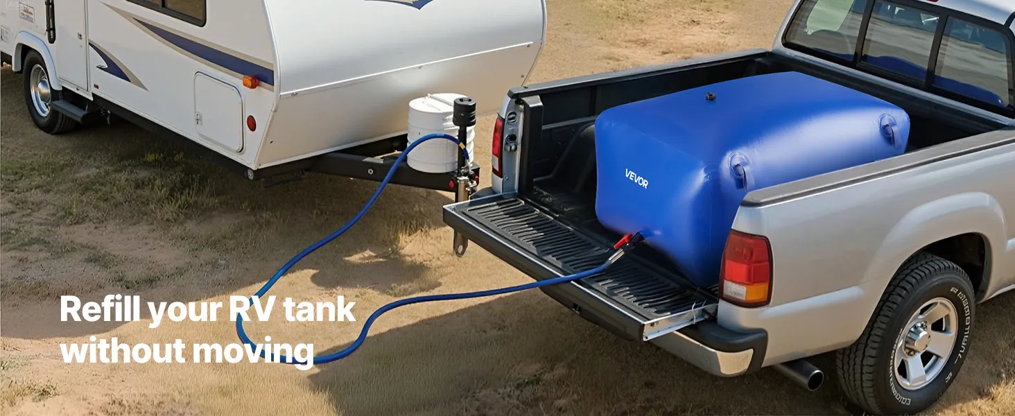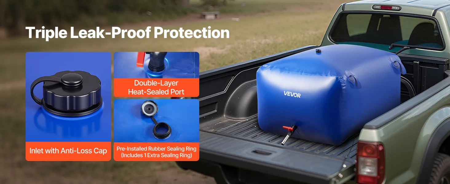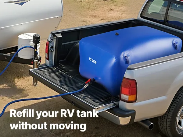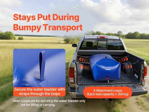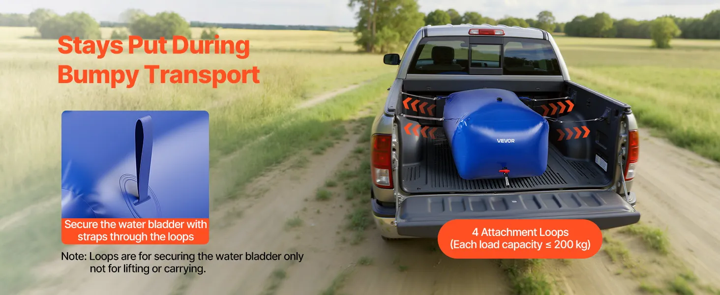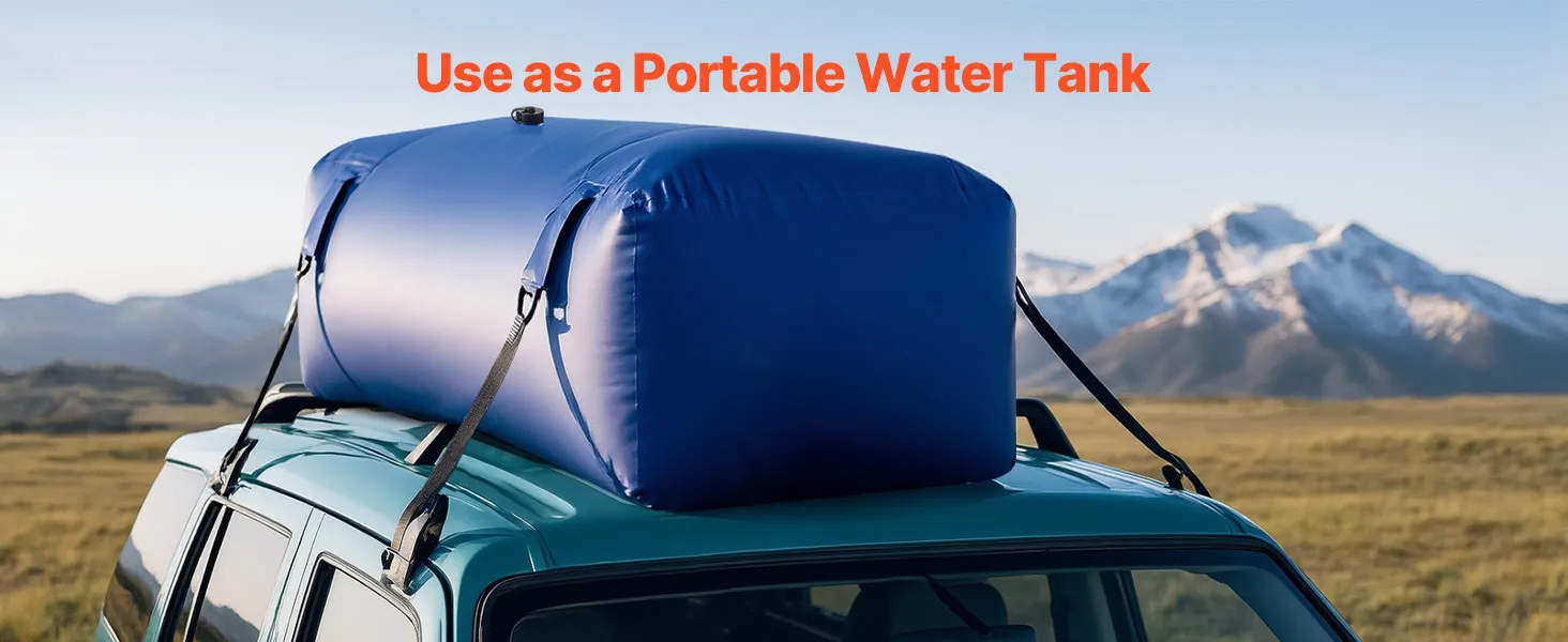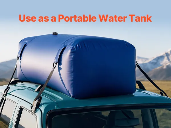 • Portable & Space-Saving: Designed with 4 sturdy D-rings, the soft water bag can be secured in a pickup bed, SUV, or rooftop with straps to avoid shifting during transport. The soft PVC material folds compactly when empty, making it easier to store and carry compared to bulky tanks.