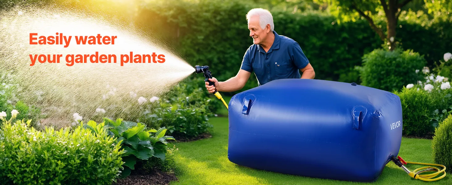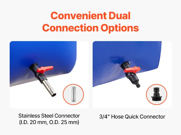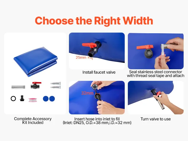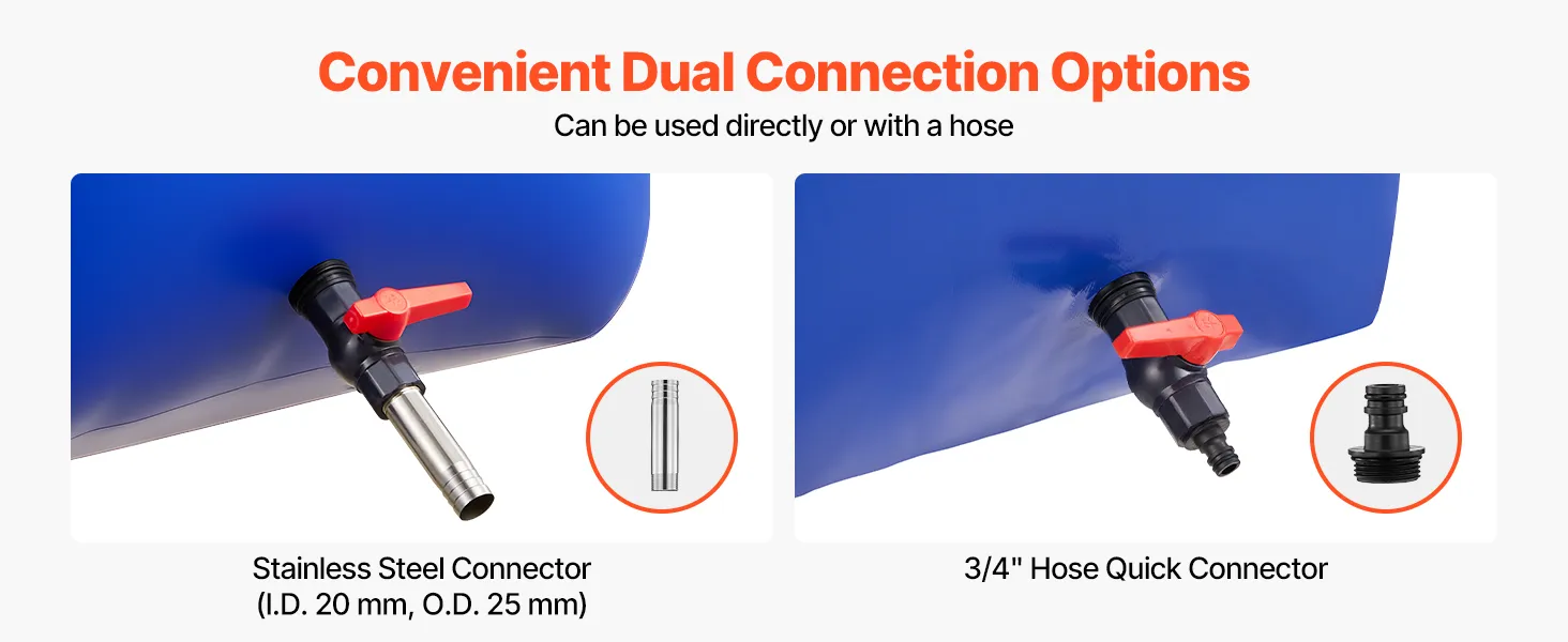 • Easy to Use: The water storage bag comes with pre-installed inlet (DN25, outer thread 32 mm) and outlet (DN20, outer thread 25 mm) connectors allow quick setup. Simply attach the included faucet valve and connect a garden hose for filling or draining—ready to use in minutes.