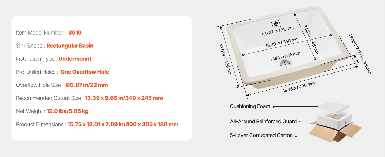 VEVOR Undermount Bathroom Sink, 400 x 305 mm Rectangular White Ceramic Vessel Sink with Overflow Hole, Under Counter Drop in Modern Lavatory Vanity Bath Wash Bowl Basin, Rectangle for Small Space