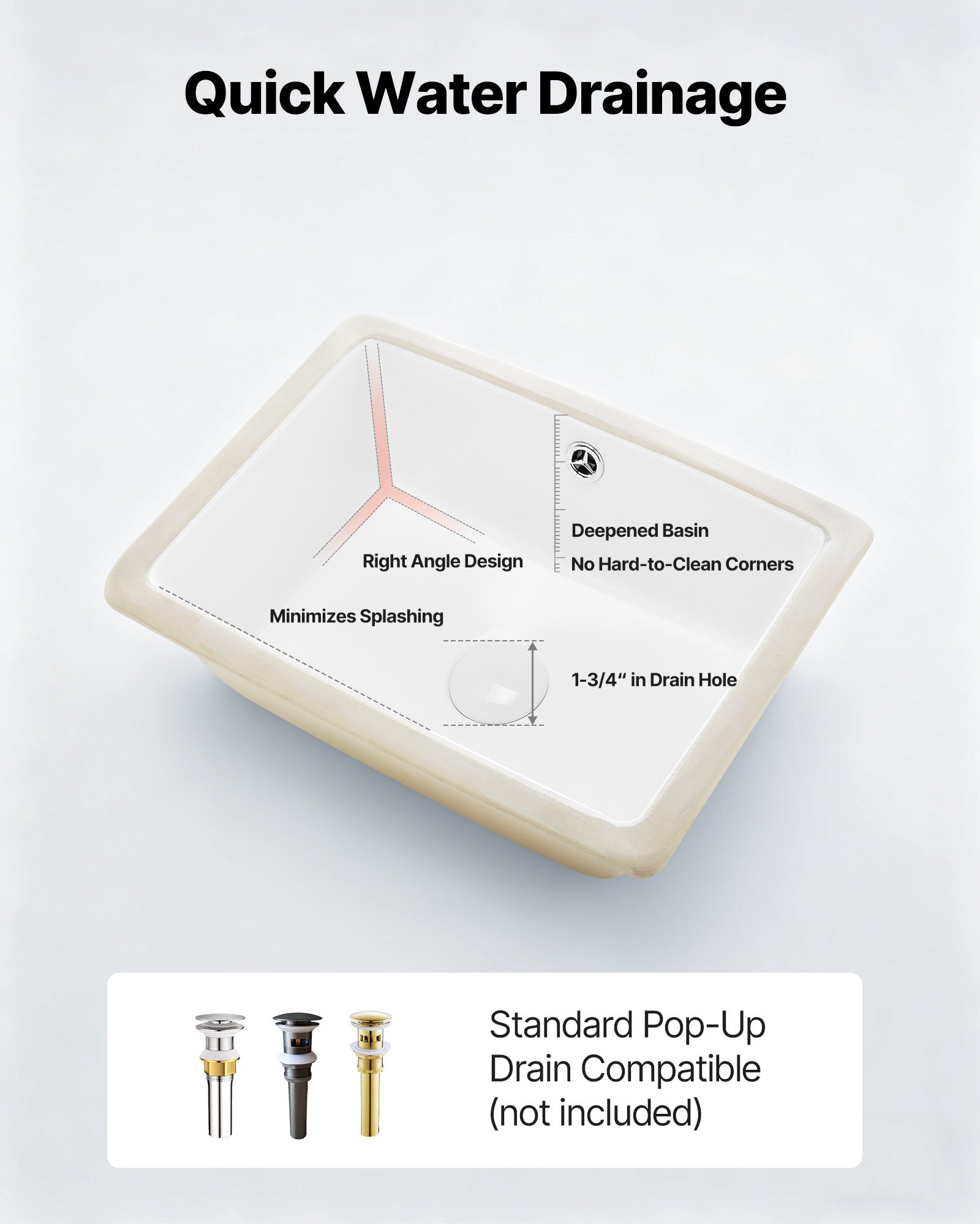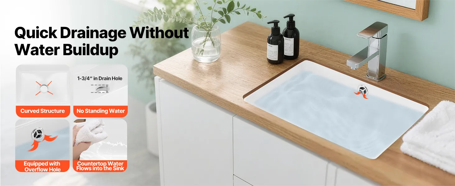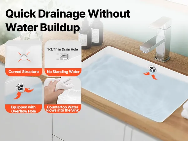 Designed with a wide drain hole, the bathroom undermount sink supports water flowing out smoothly with no water pooling left. It resists odor and keeps the sink clean and dry, delivering a more comfortable, efficient washing experience.