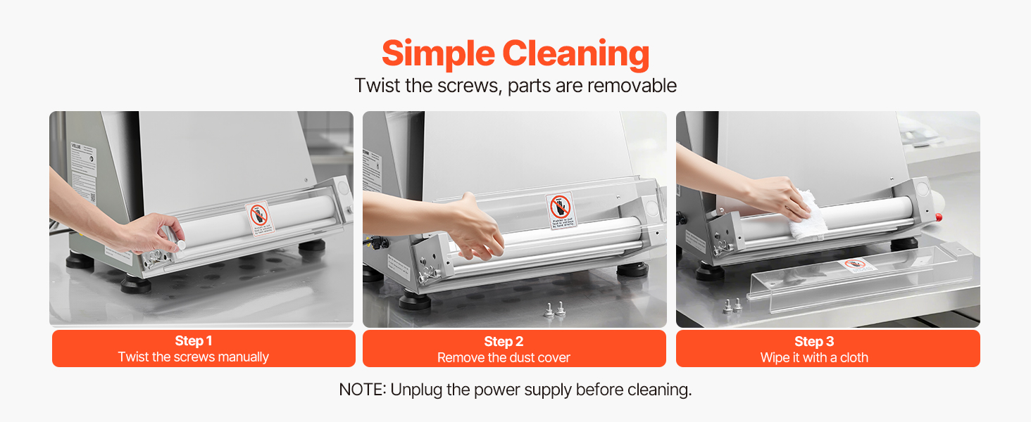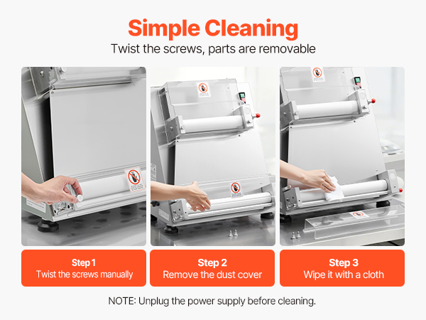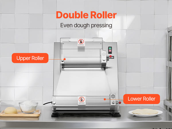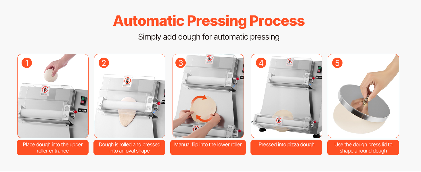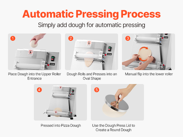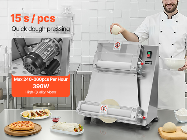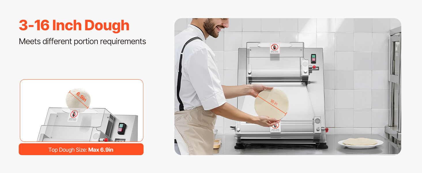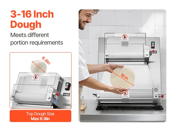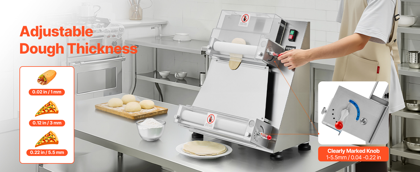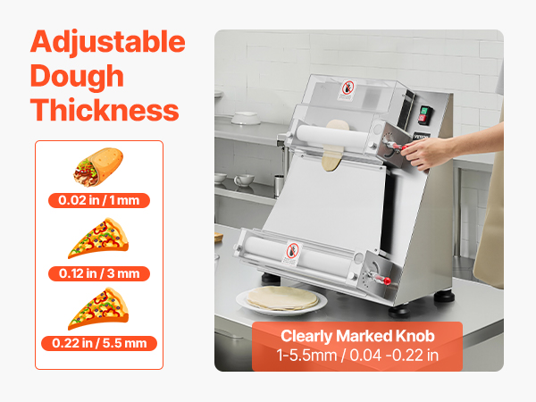 The electric pizza dough roller can press dough sizes from 3-16 inches, with adjustable thickness (1-5.5mm / 0.04 - 0.22 in). You can easily adjust it to press various dough types.