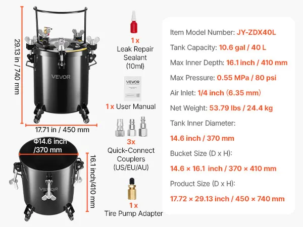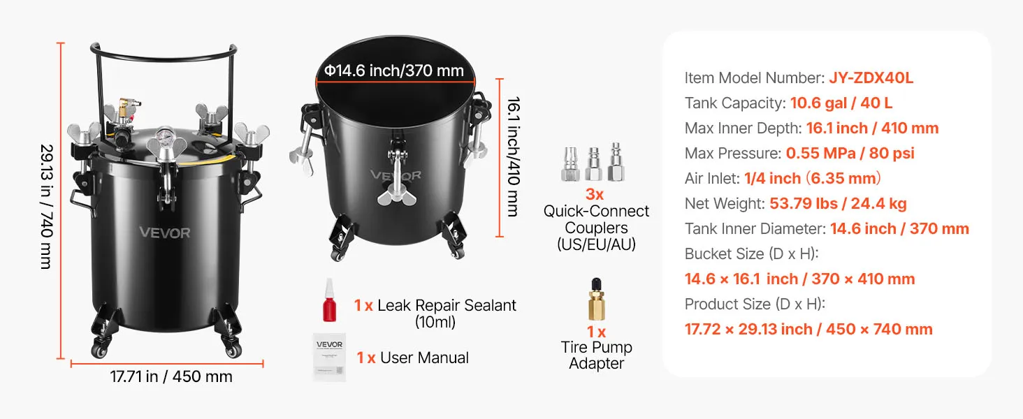• Large Capacity Design: Our 10.6 gal/40L spray paint pressure pot handles large pours, allowing artists and DIYers to create multiple pieces or sizable studio projects. Features a 1/4″ (6.4mm) air inlet for easy connection to an air compressor (not included) for efficient workflow