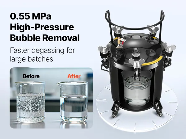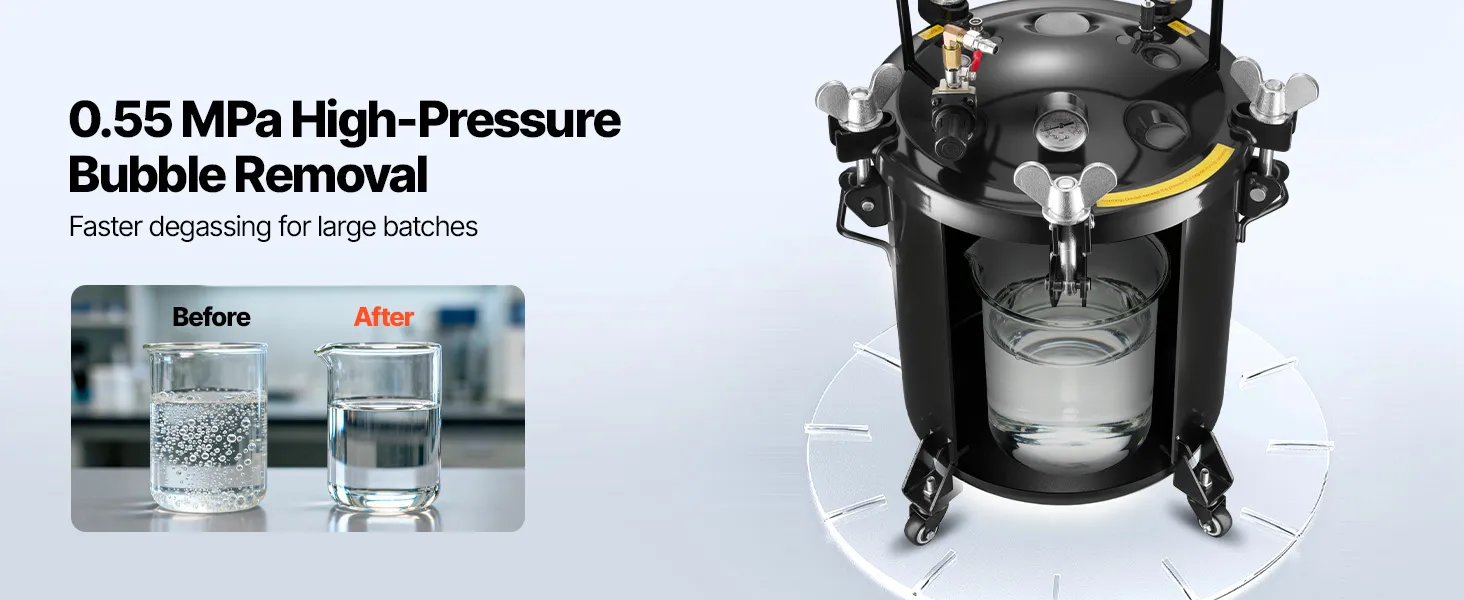 • Efficient Degassing: This pressure pot tank is designed for pouring projects, applying up to 0.55 MPa/80 psi to efficiently remove 99% of internal bubbles, producing bubble-free, crystal-clear DIY pieces with smooth surfaces, ideal for artists, crafters, and studio projects