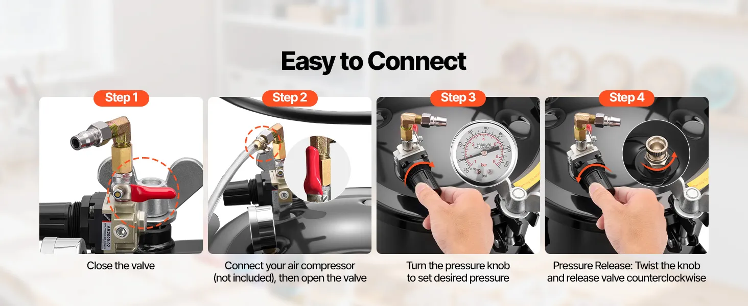• Adjustable Pressure: This pressure chamber features an adjustable pressure knob and a precise gauge to monitor real-time pressure. If pressure exceeds 0.5 MPa, the built-in valve automatically releases excess air, ensuring controlled and reliable operation throughout your projects