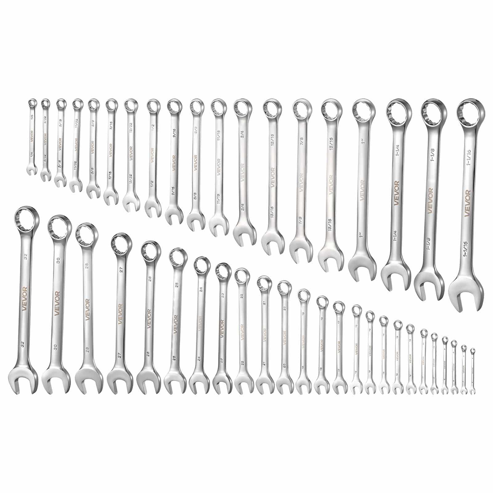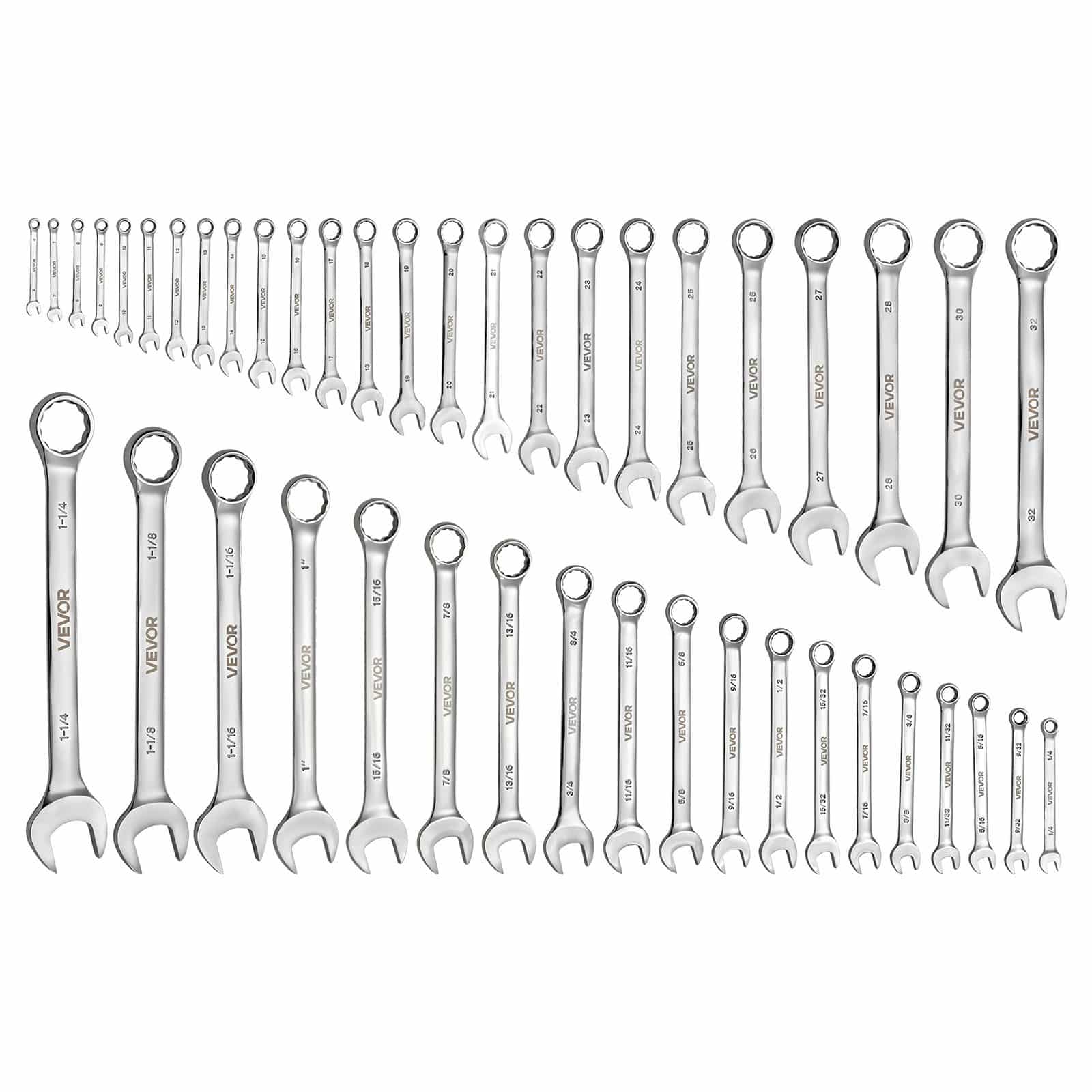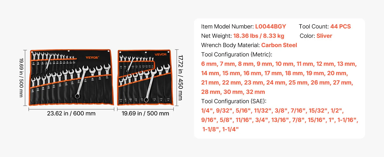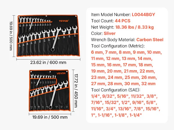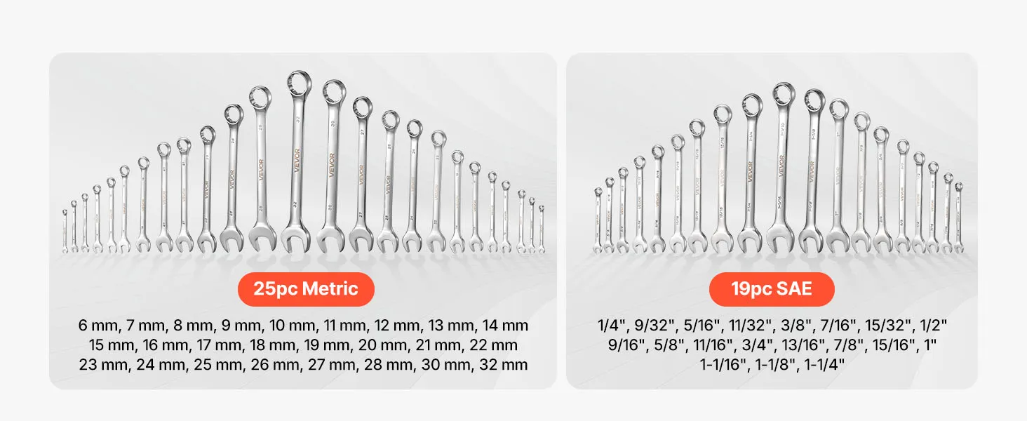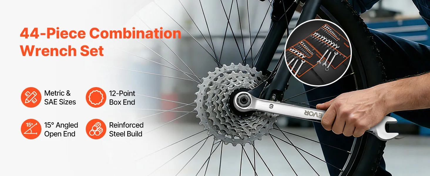 VEVOR Combination Wrench Set, 44-Piece SAE and Metric, 12-Point Box End and 15° Angled Open End Combination Wrenches with Roll Up Pouch, Carbon Steel, for General Household and Automotive Repairs