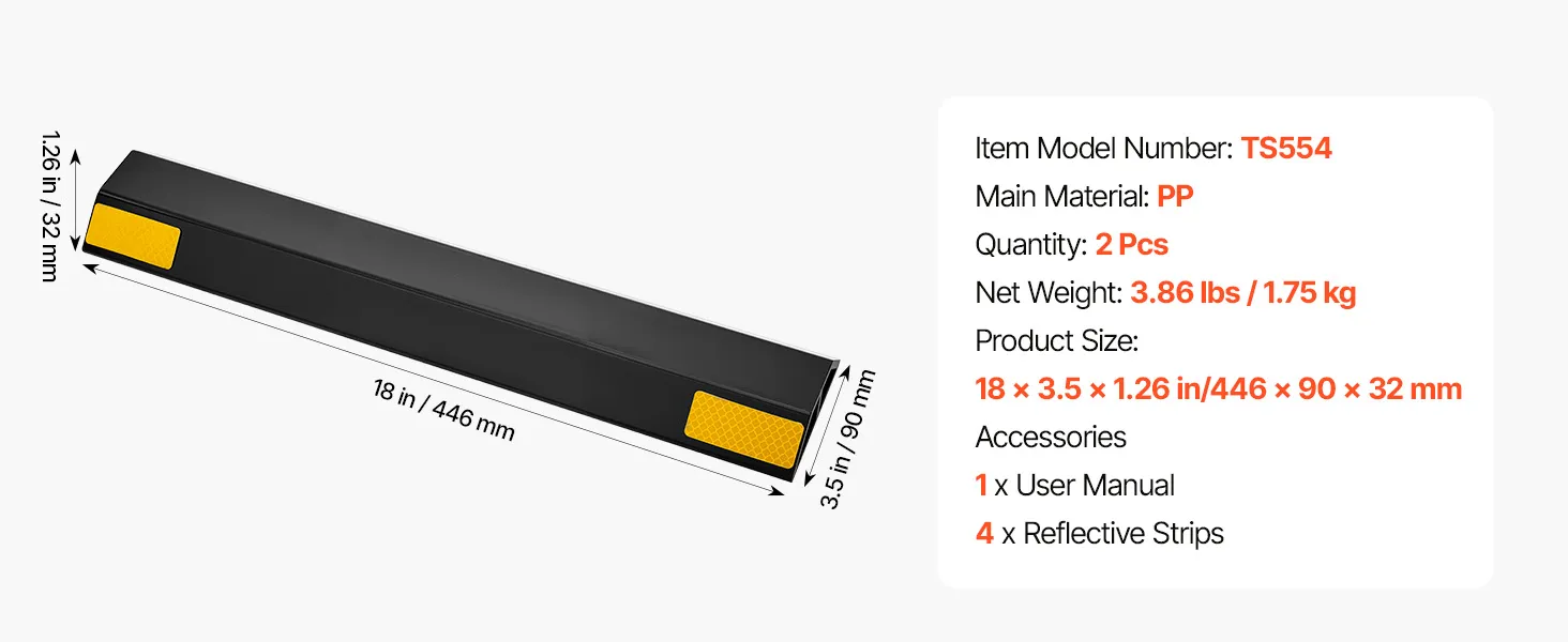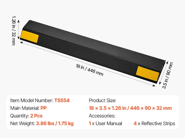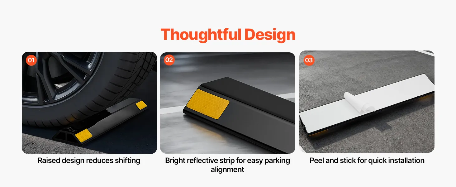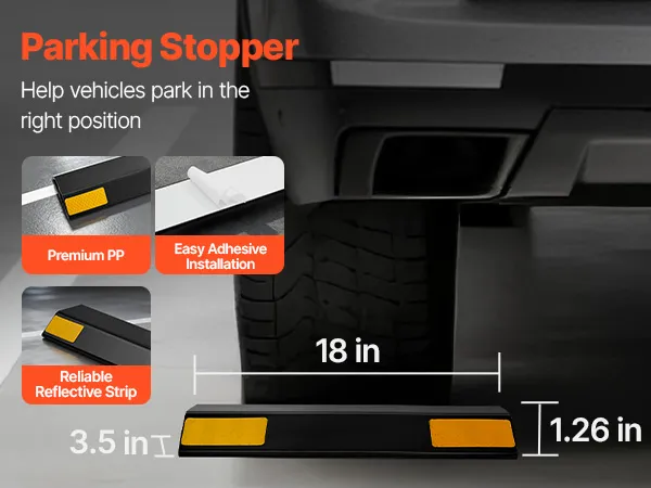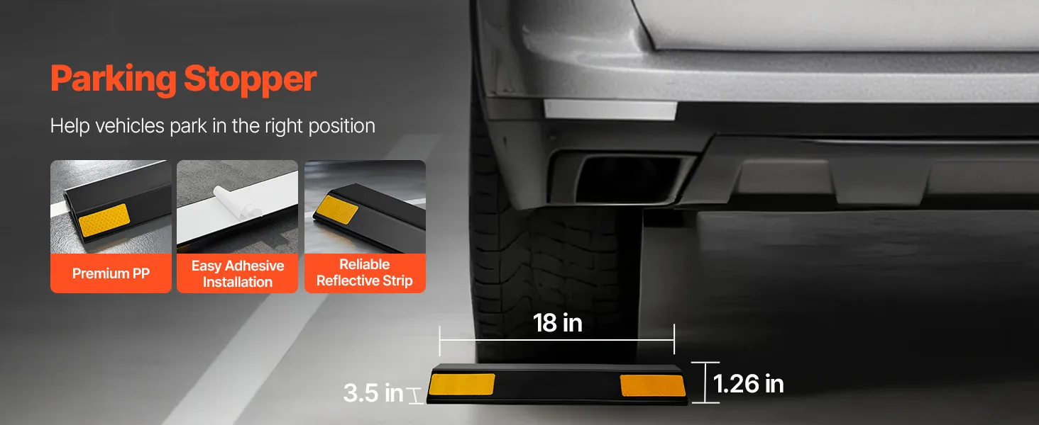Made of premium PP material with an adhesive design, our parking stopper is easy to install. Equipped with reflective strips, it improves nighttime parking confidence.