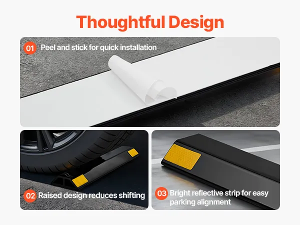 Our parking block features a raised design to reduce shifting. Bright reflective strips make it easy to identify the parking spot. Just peel and stick for quick installation.
