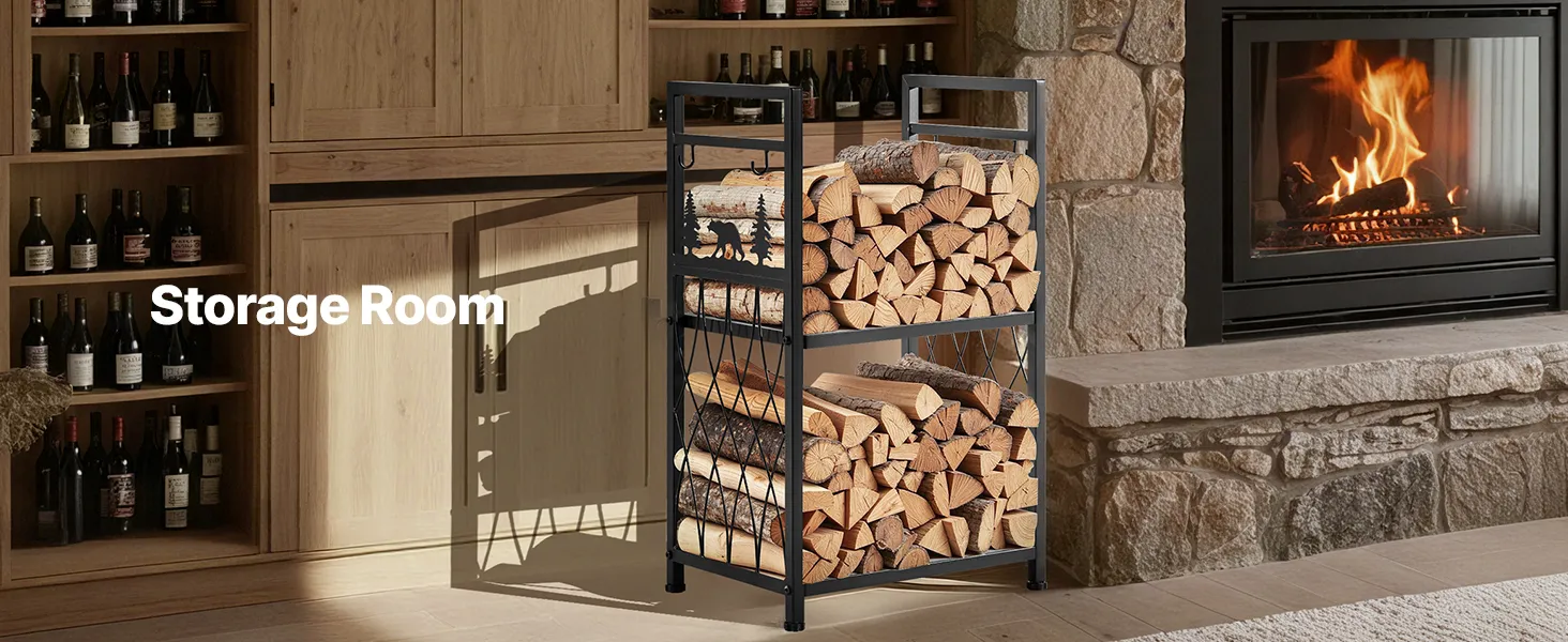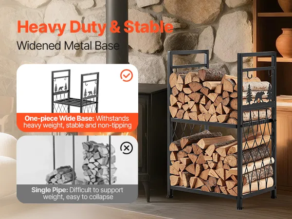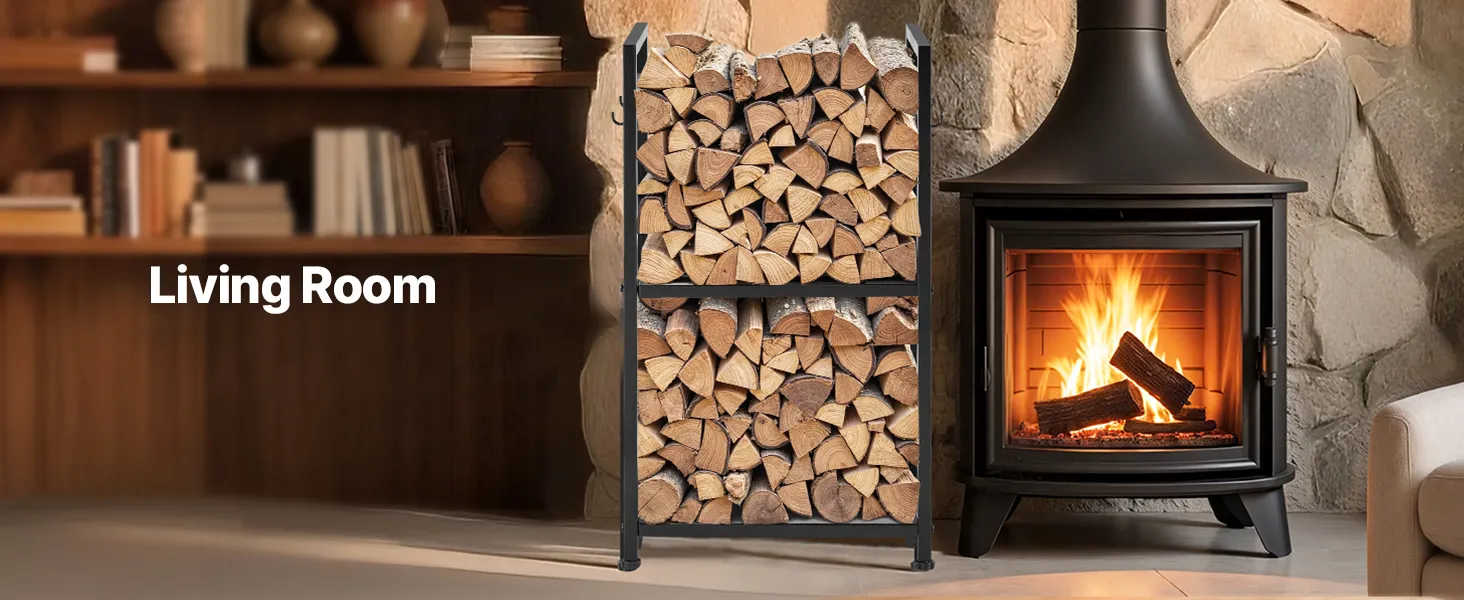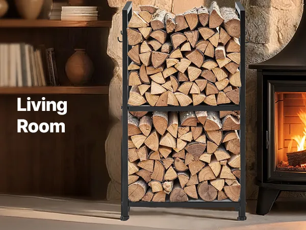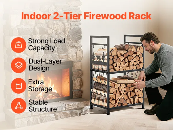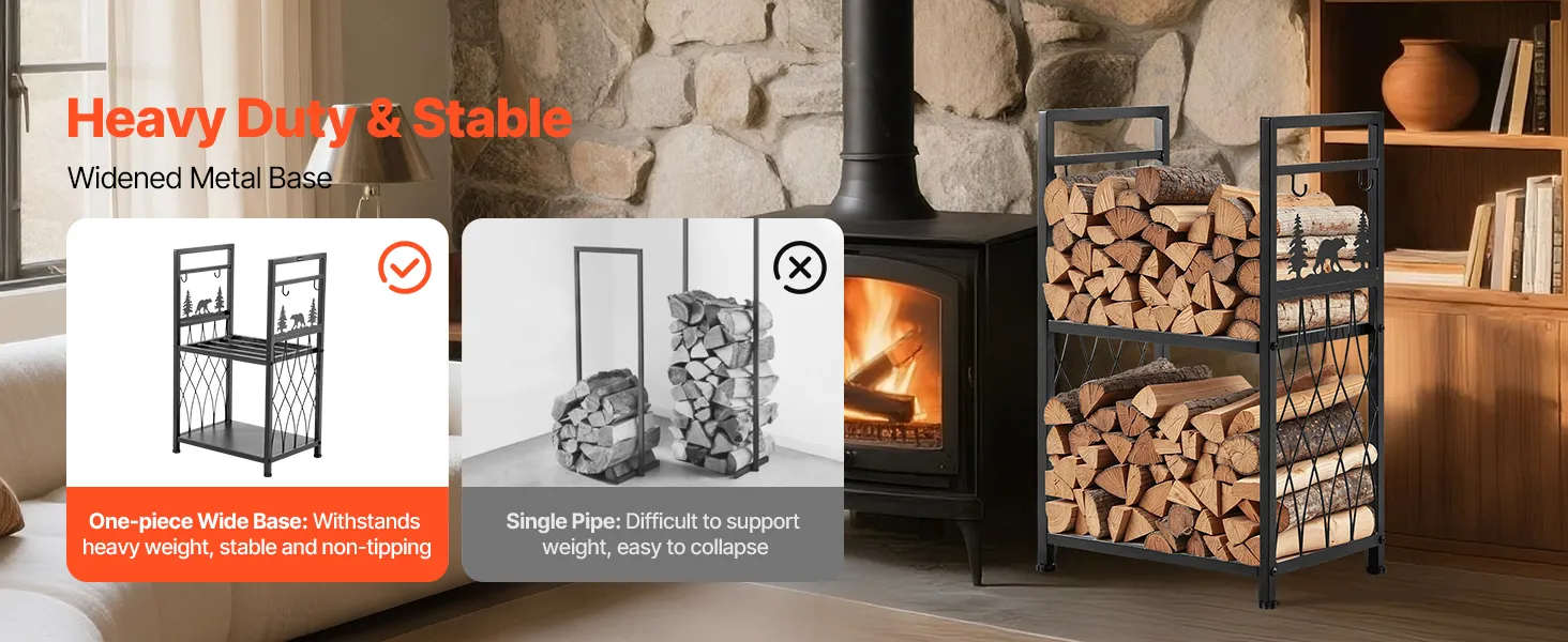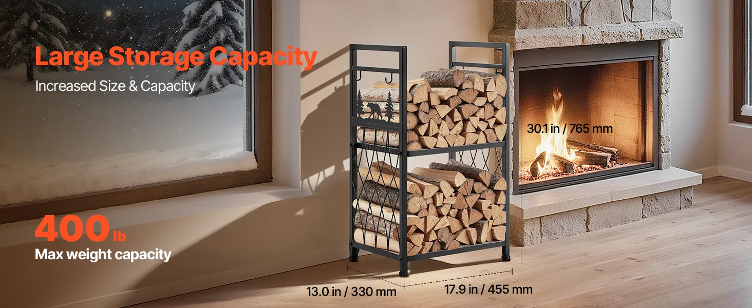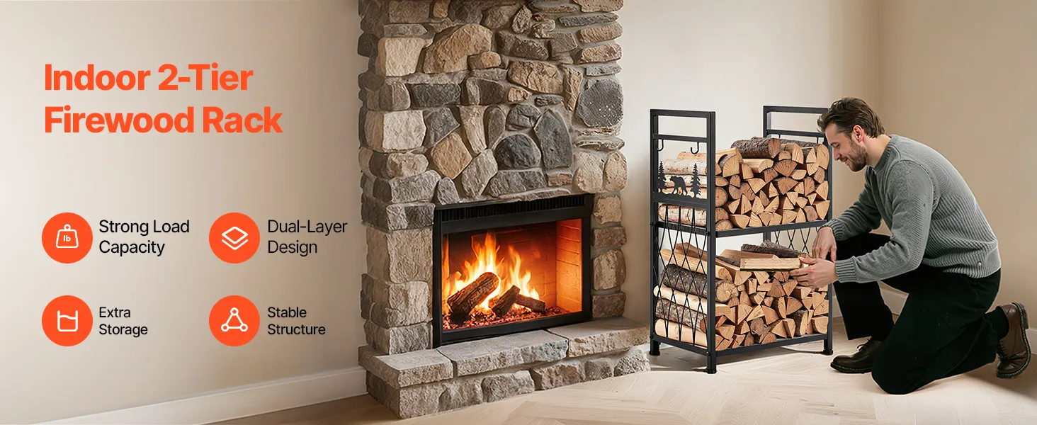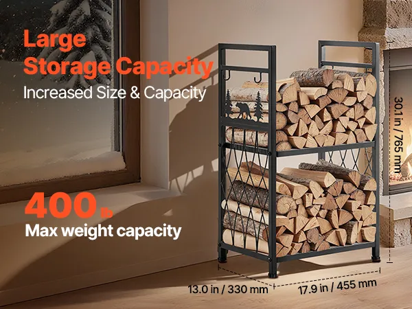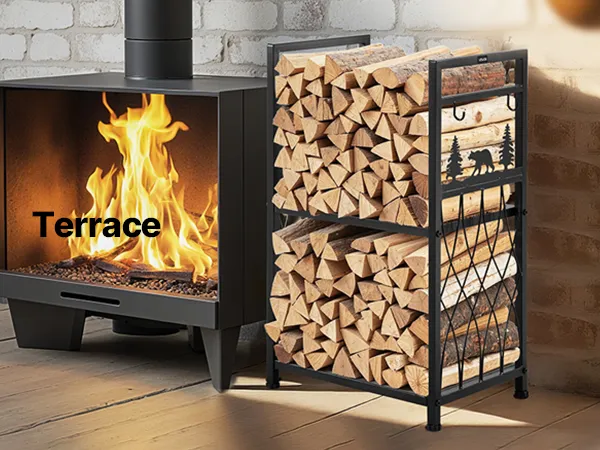 This firewood rack features a sturdy double-layer design that evenly distributes weight and prevents deformation. Supports up to 400 lbs, accommodating various log sizes. Includes 4 durable forged iron fireplace tools that resist heat and are easy to hang.