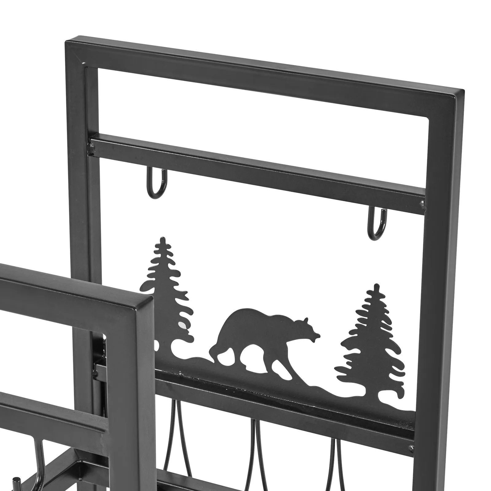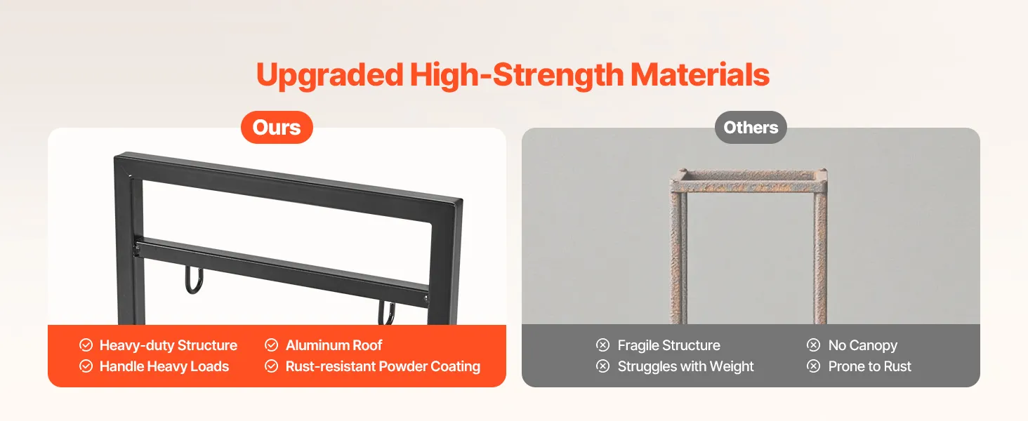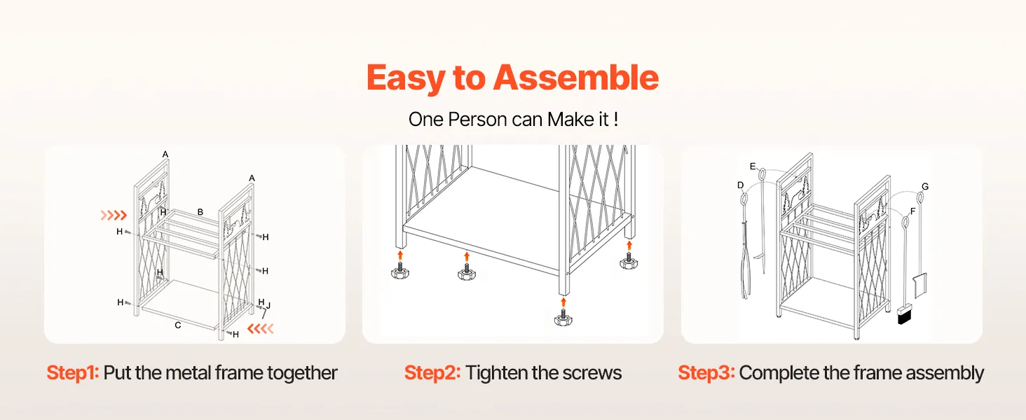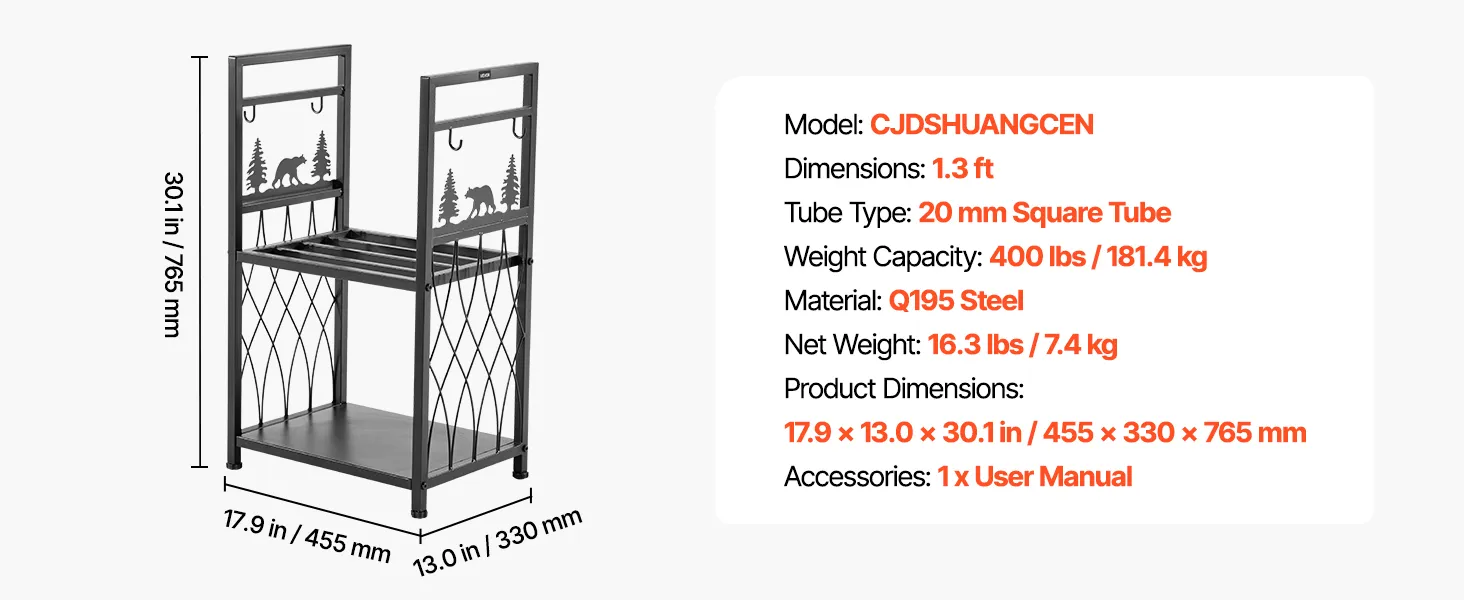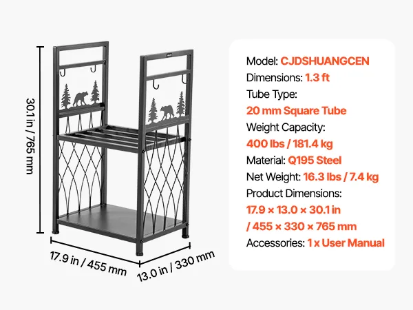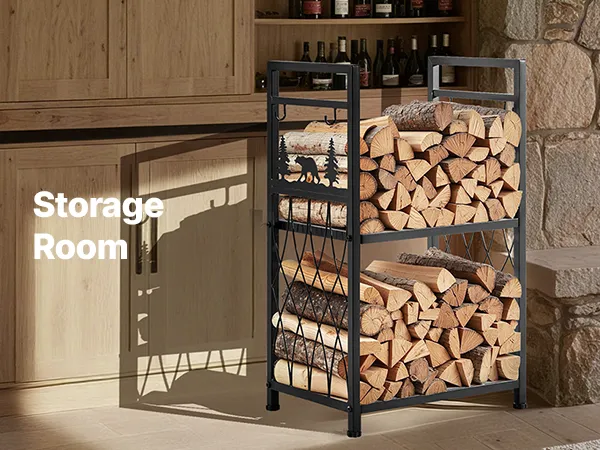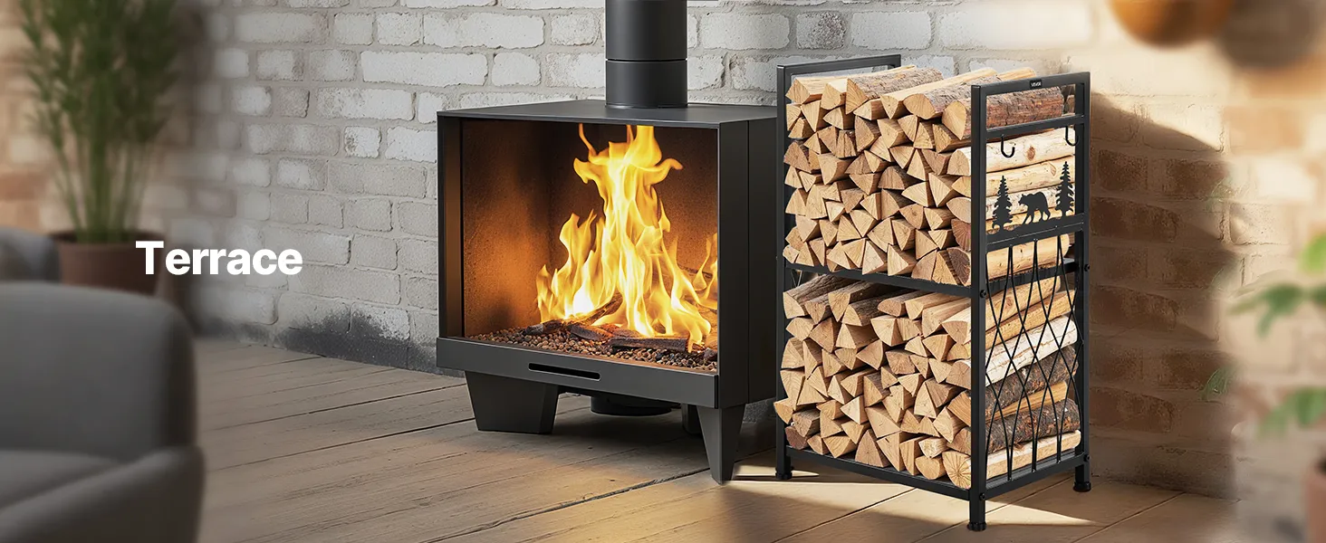This firewood rack features a sturdy double-layer design that evenly distributes weight and prevents deformation. Supports up to 400 lbs, accommodating various log sizes. Includes 4 durable forged iron fireplace tools that resist heat and are easy to hang.