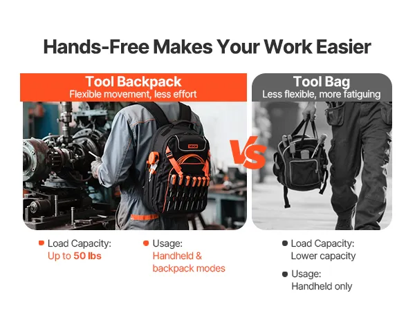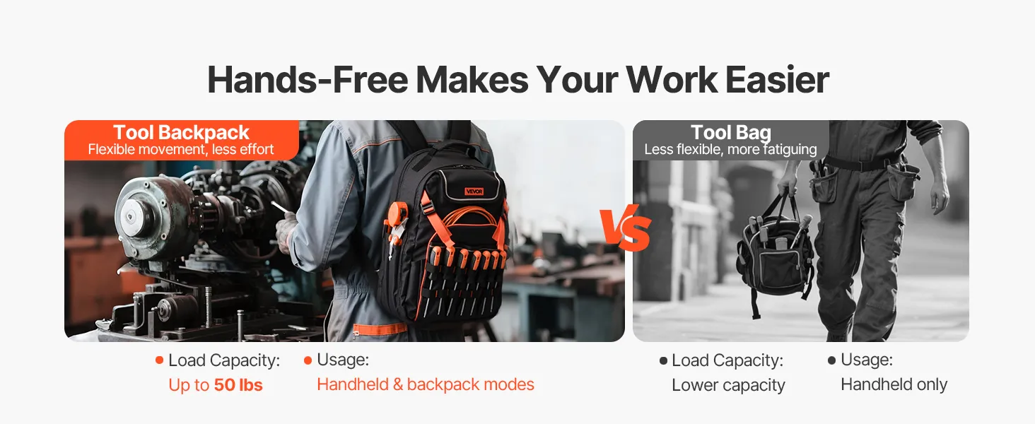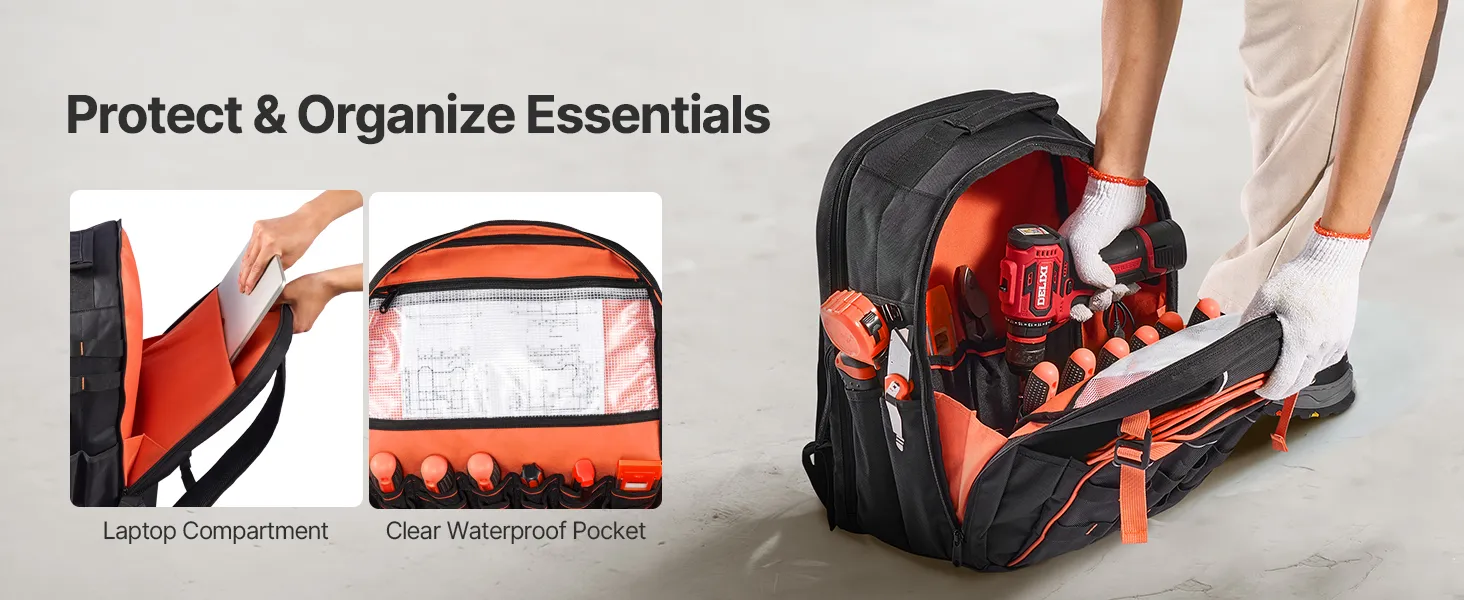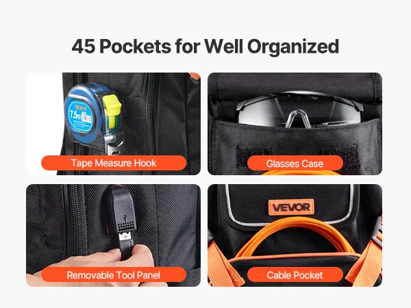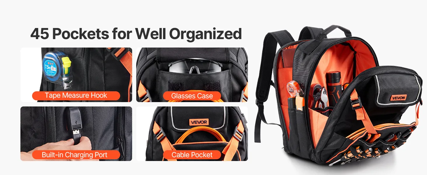 • 45 Pockets for Organization: This tool backpack (13 x 8.66 x 17.3 inches) holds up to 50 lbs and features 45 pockets, including a removable divider. Ideal for wrenches, drills, and more! Plus, it has a laptop compartment and charging port