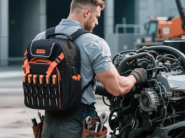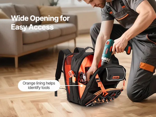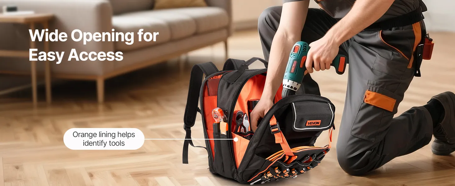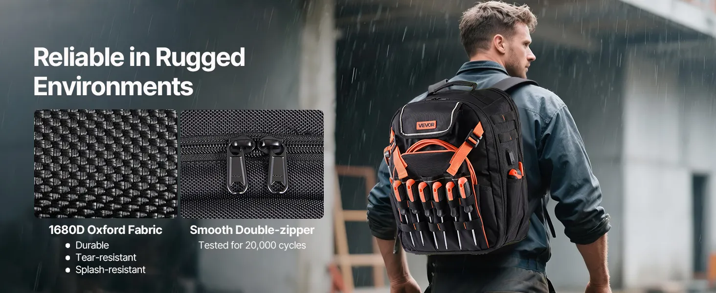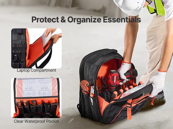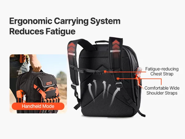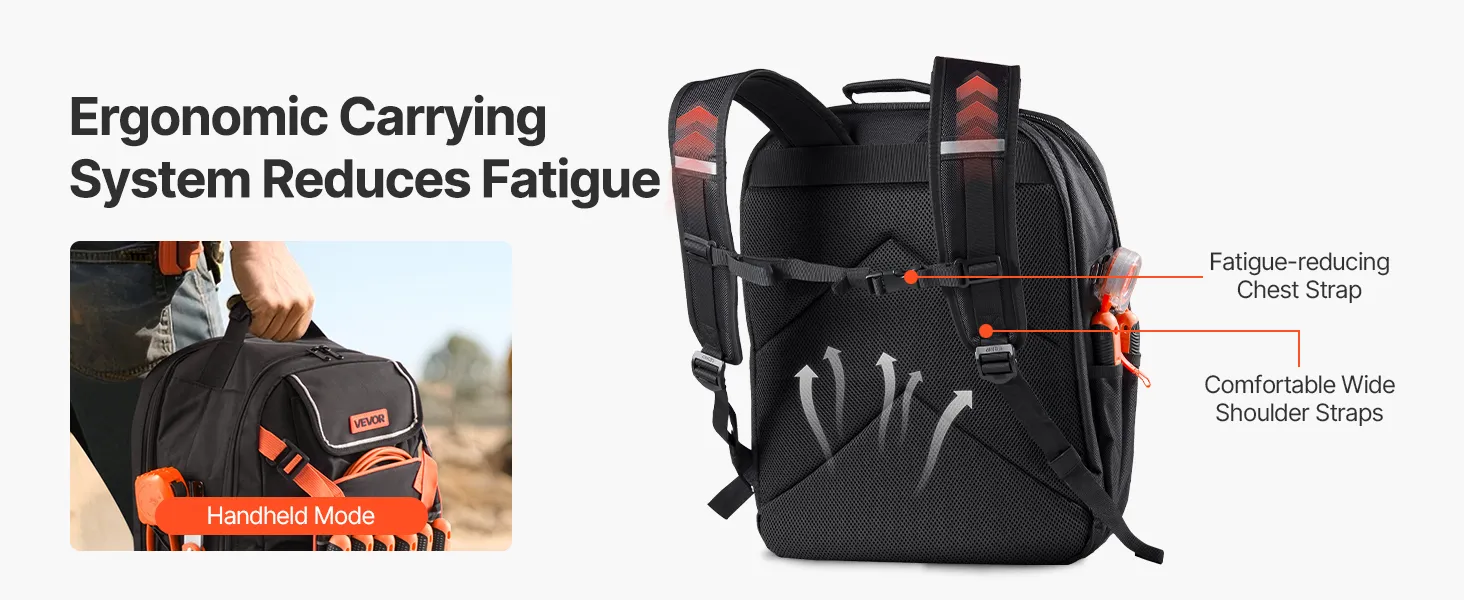 • Эргономичный дизайн для комфорта: попрощайтесь с нагрузкой на плечи! Благодаря широким мягким ремням и регулируемым нагрудным пряжкам этот рюкзак для работы на стройплощадке облегчает переноску тяжелых инструментов. Дышащая задняя панель сохраняет прохладу, а верхняя ручка добавляет универсальности