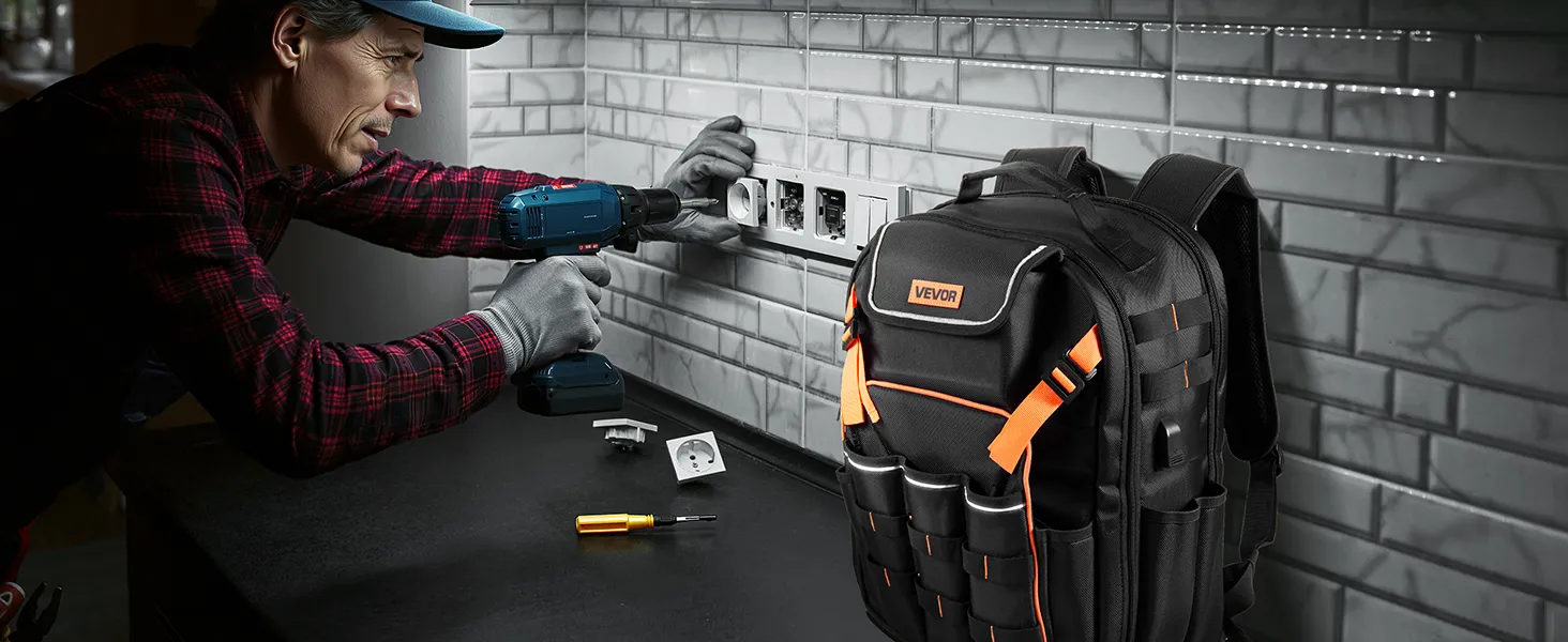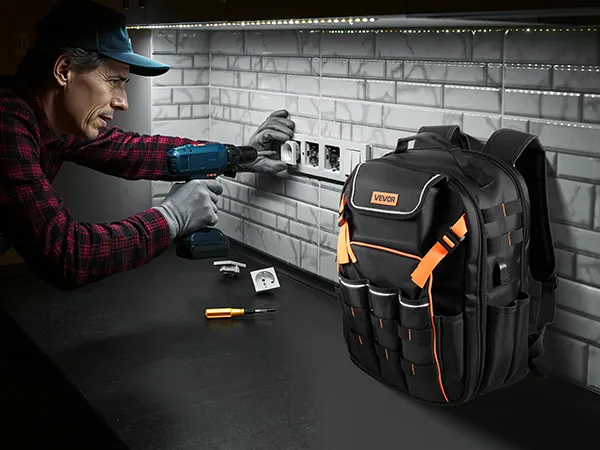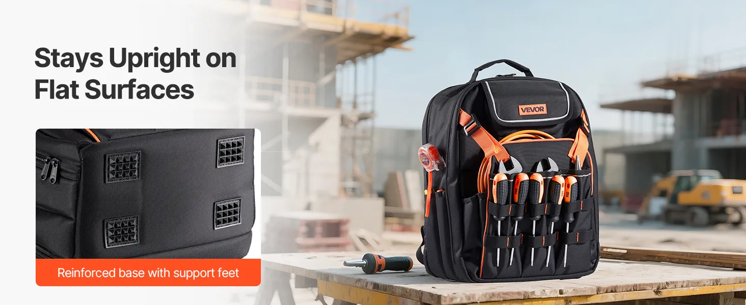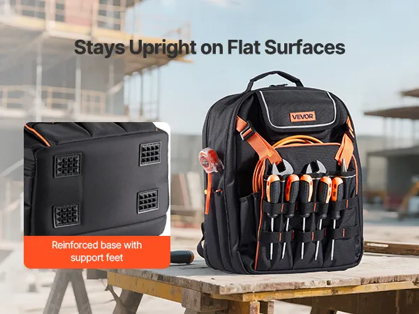 • Устойчивое основание для легкого доступа: Усиленное основание с 4 опорными ножками надежно удерживает ваш рюкзак электрика на стройплощадке даже полным! Разместите его в любом месте, не беспокоясь о опрокидывании или повреждении. Он создан для защиты от ударов, влаги и острых предметов, защищая ваши инструменты в течение всего дня.