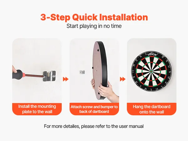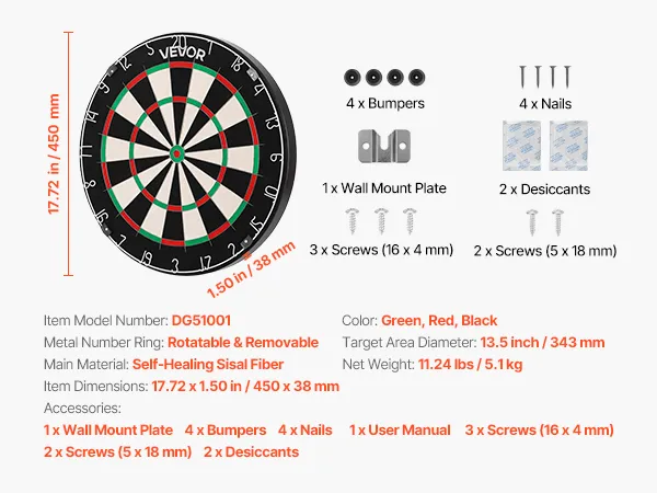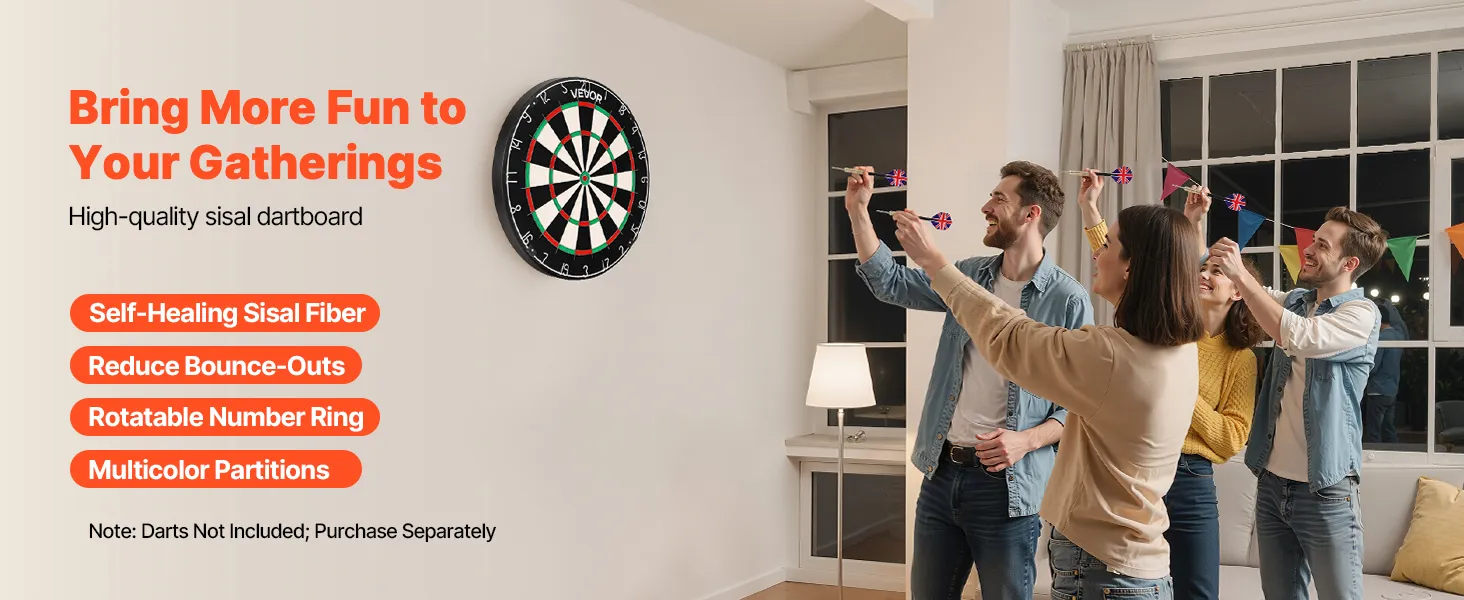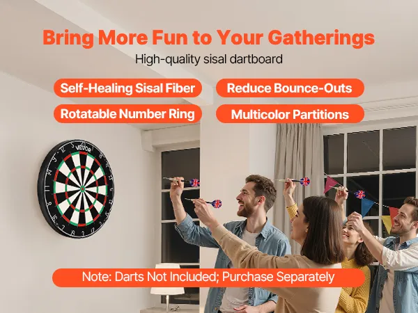 Crafted from self-healing African sisal fibers with a staple-free bullseye and rotatable number ring to enhance hit rate and reduce bounce-outs, this dartboard brings fun and relaxation to family entertainment or gatherings, making it the ideal addition to your home, game room, or clubhouse.
